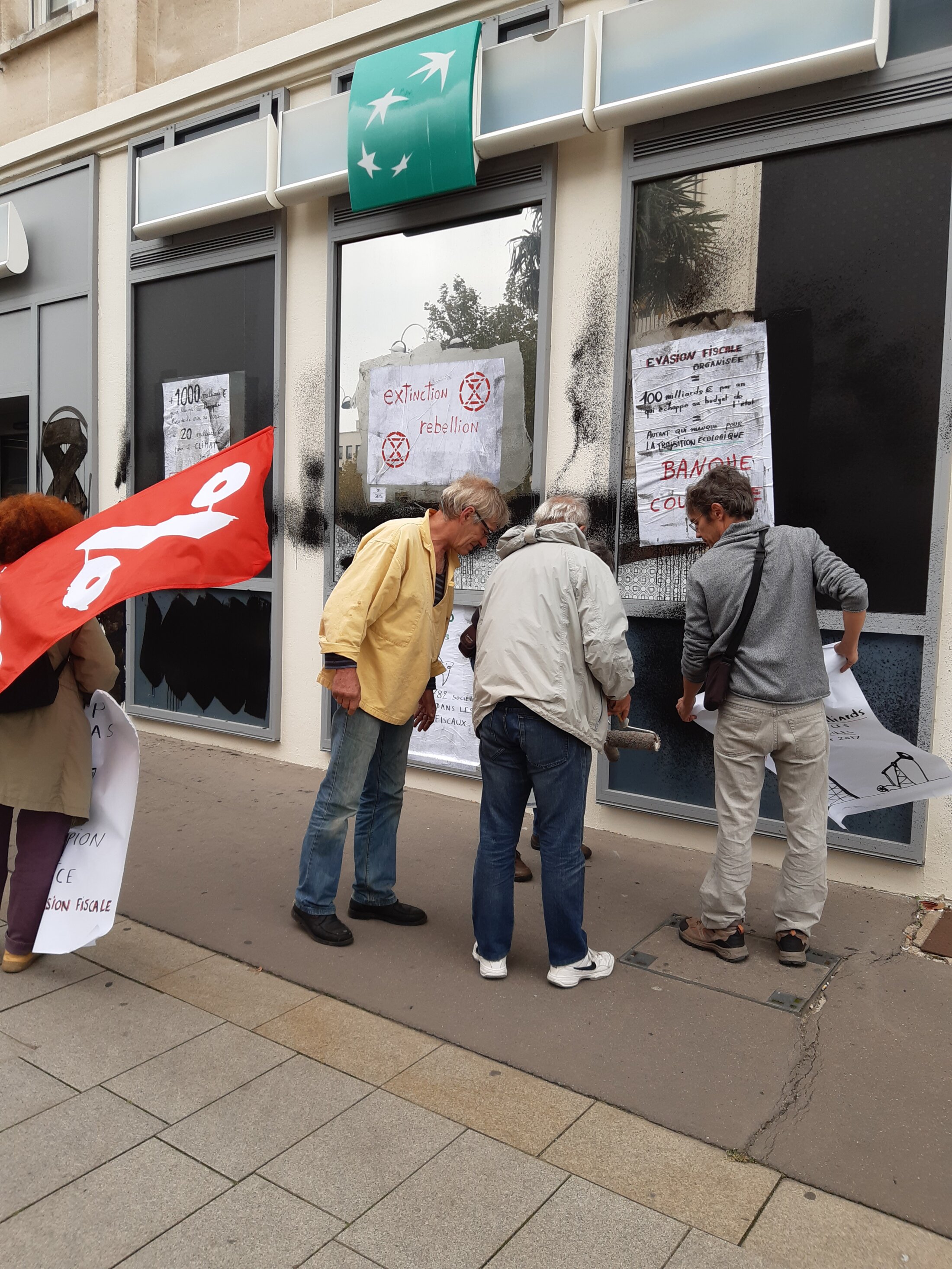 Il est 14h ce samedi après-midi, lorsqu'au loin se dirige vers le centre-ville de Saint-Nazaire, un cortège banderoles à la main, sono poussée au maximum. Les manifestants viennent de "salir" l'agence du Crédit Agricole et se dirigent vers un autre établissement bancaire. Ils ont répondu à l'appel d'Extinction Rébellion, d'Attac 44 et de Youth For Climate Saint-Nazaire. Ils ne sont pas d'une vingtaine. C'est la deuxième action qu'ils mènent dans le cadre du RIO (Semaine de Rébellion Internationale d'Octobre) dans leur ville.