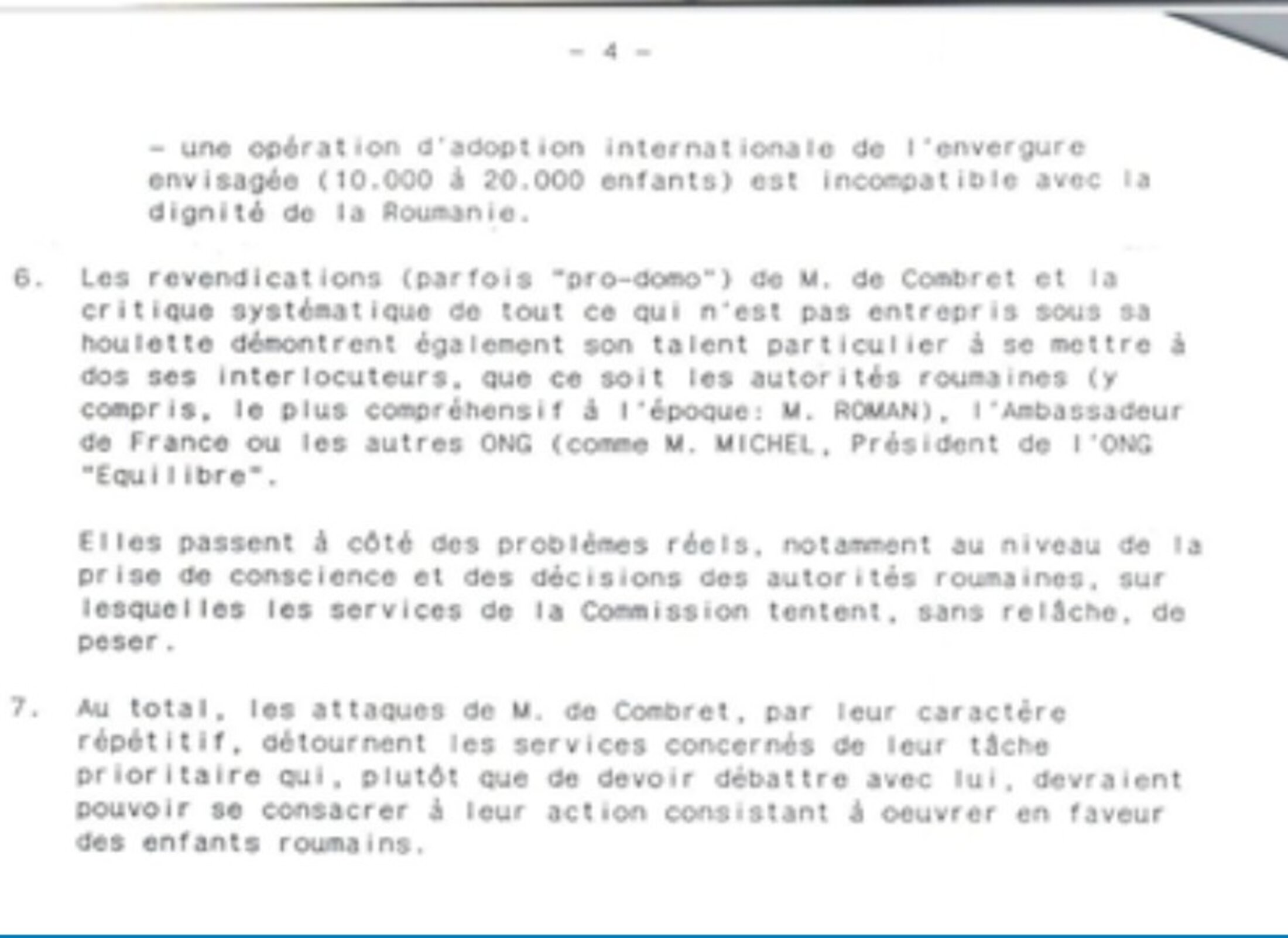 Dès les années 90, une note du cabinet Delors critique explicitement une opération d'adoption internationale de 10 000 à 20 000 enfants comme incompatible avec la dignité de la Roumanie, accusant de Combret de critiques systématiques et répétitives qui détournent les services de leur tâche prioritaire d'œuvrer pour les enfants.
