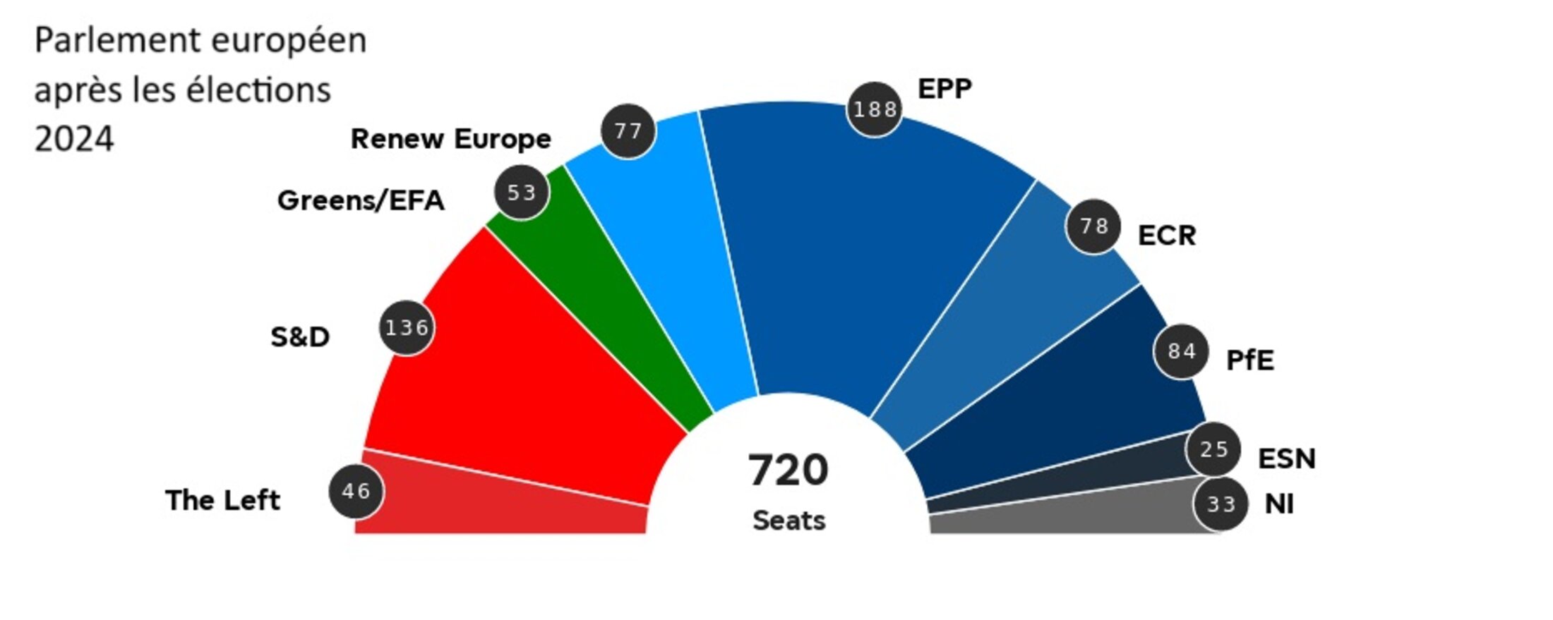 Premièrement, les groupes à gauche de l'hémicycle européen - gauche radicale (La Gauche), verts (Verts/ALE), socialistes (S&D) et libéraux (Renew) - ne peuvent plus former de majorité seuls. Leur poids cumulé dans l'hémicycle passe de 50,3% des sièges (355 sur 705) à seulement 43,3% (312 sur 720). Les pertes sont particulièrement lourdes pour les verts (-8,2 points), les libéraux (-3,8 points), et, dans une moindre mesure, les socialistes (-1,6 points), contrairement à la gauche radicale en légère progression (+1 point).