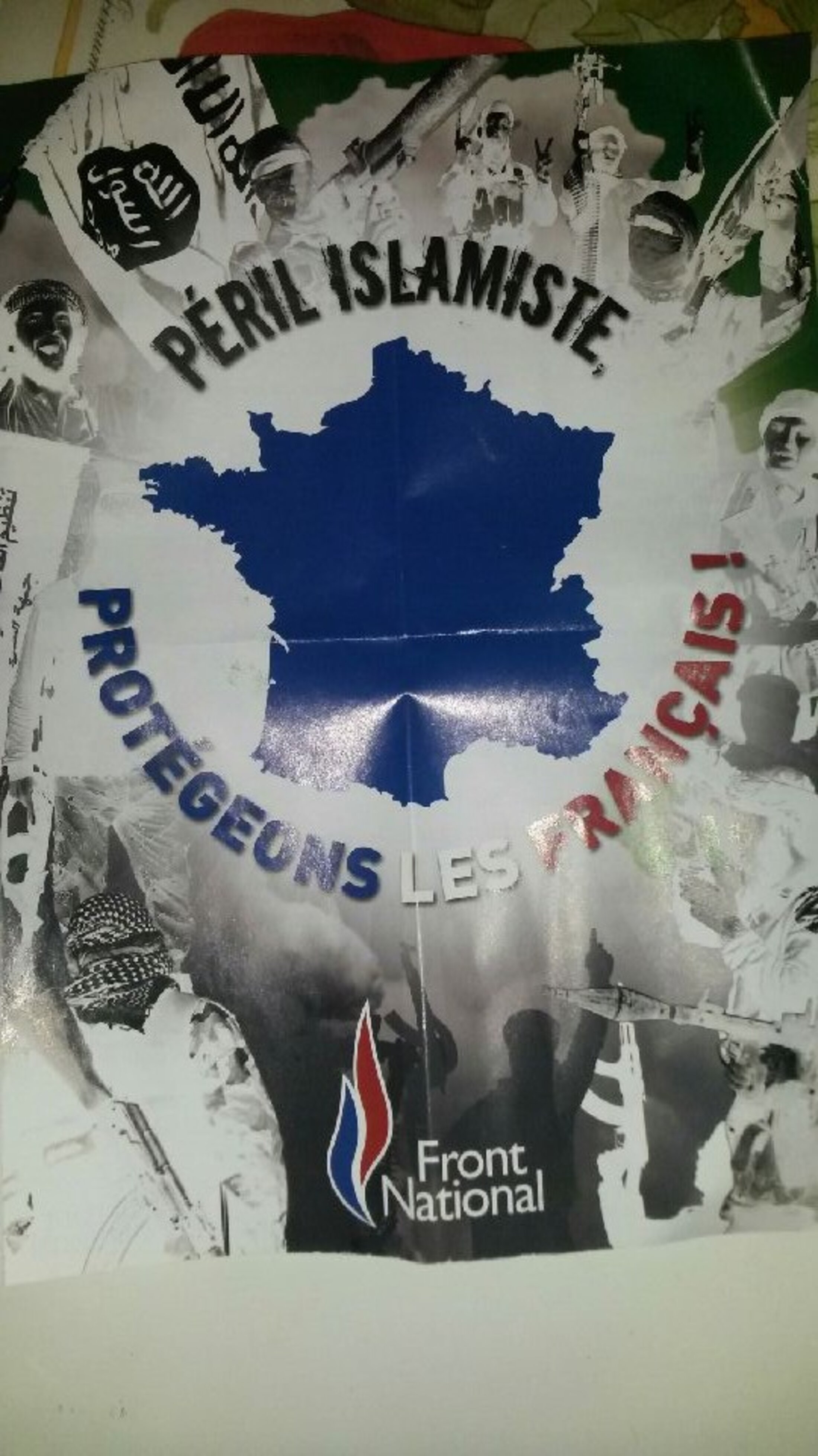 Dernier point et pas des moindres : le recto de ce tract. La première image qui est destinée à choquer (et ça marche) celui qui la voit. Que peut-on y voir ? Une France encerclée par des combattants de l'organisation terroriste « État Islamique ». Oubliant de préciser que l'écrasante majorité des victimes de l'état islamique est musulmane. Et que lorsque ces populations menacées par la barbarie de « Daesh » cherchent un asile, notamment en France, le FN crie à l'invasion. Il faudrait savoir !