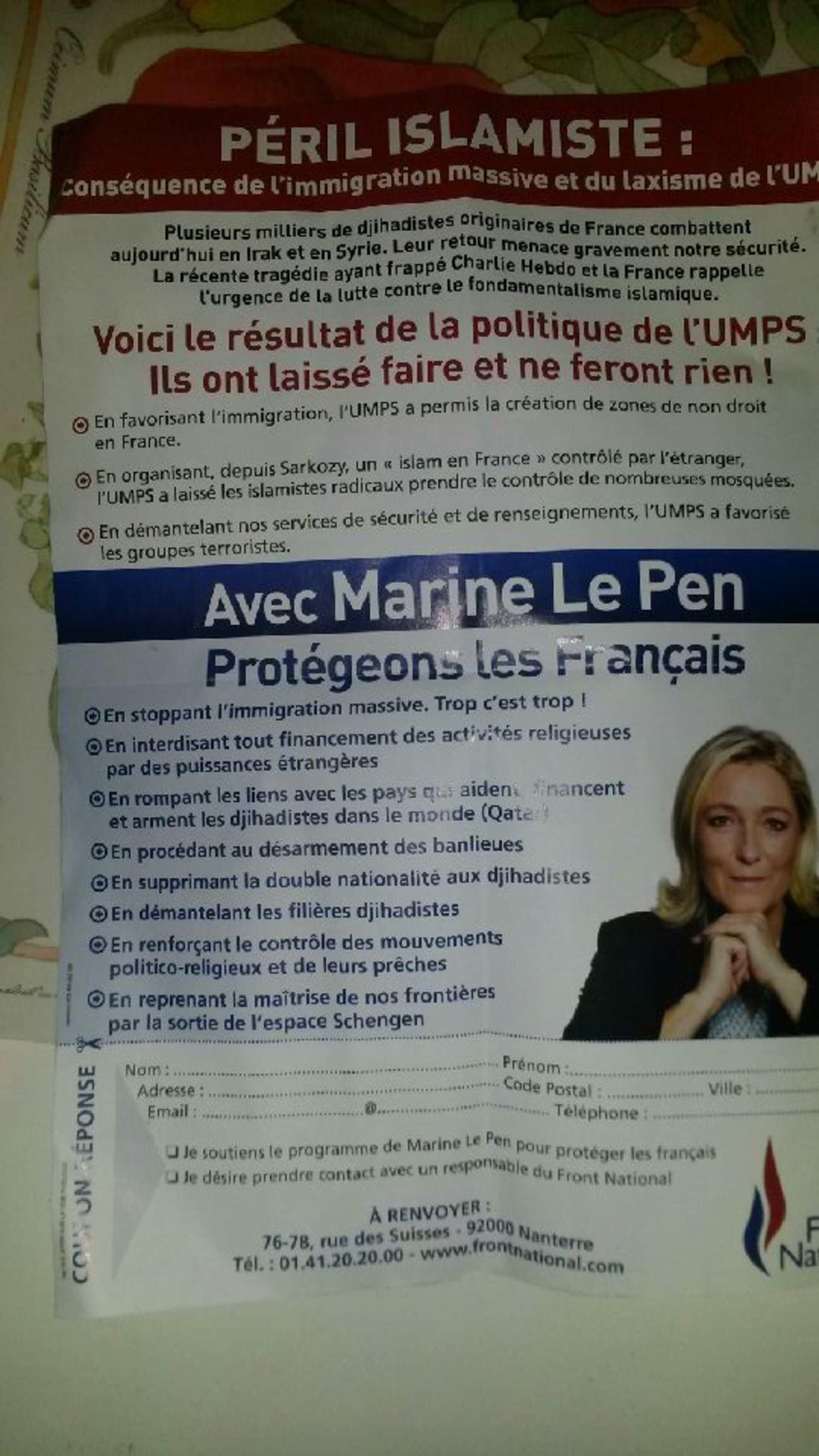 La période électorale actuelle charrie son lot de tracts, prospectus et autre propagande politique dans nos boîtes aux lettres. Elle est censée être le moment où, si vous ne vous intéressez pas quotidiennement à la politique, vous comparez les programmes et les candidats, pour faire votre choix au moment du vote. Un grand moment démocratique donc. Malheureusement, tout le monde n'a pas cet esprit. Tout le monde ne cherche pas à avoir un débat sain. Certains profitent plutôt de l'instant électoral pour propager des peurs imaginaires pour faire voter en leur faveur. Vous les aurez reconnu, c'est le Front National. Dijon en a été le témoin malheureux.