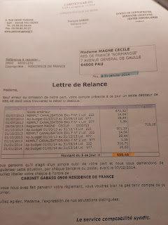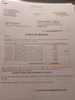 Madame Cécile MAGNE reçoit 3 rappels d'impayés pour les charges de ses appartements de Pau (Cabinet GABAIG) : 2 450,83 euros.