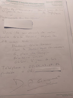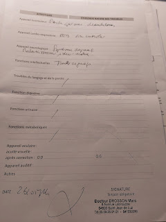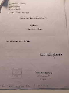Un médecin généraliste traitant de Saint-Jean-de-Luz (qui m'avait été conseillé par un médecin généraliste-médecin du sport à Billère près de Pau) l'examine et fait un certificat médical détaillé, fin mai 2014 :