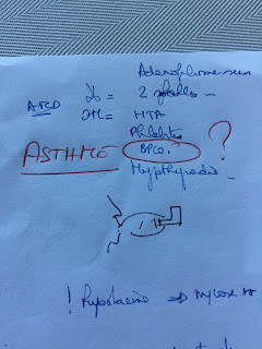 MT2 est revenu le 05/09/2018, et a écrit comme antécédent ... BPCO (la correction "asthme" en rouge, vient d'une autre personne). Le petit bonhomme très bien dessiné, c'est pour expliquer comment fonctionne la Seretide (dessin datant de décembre 2017, sur une feuille de surveillance qu'utilise Charles pour noter tout ce qui se passe pour Alexandre, constantes "pouls, TA et Saturation en Oxygène", matin et soir, comprises).