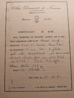 "Je soussigné R. Bouix certifie que le diamant qui orne le solitaire vendu à Maître Magne possède les caractéristiques suivantes. Le diamant est de taille moderne, sa teinte est blanche, son poids est de trois carats cinquante, son calibre est de quatre carats et il est pur à la loupe.