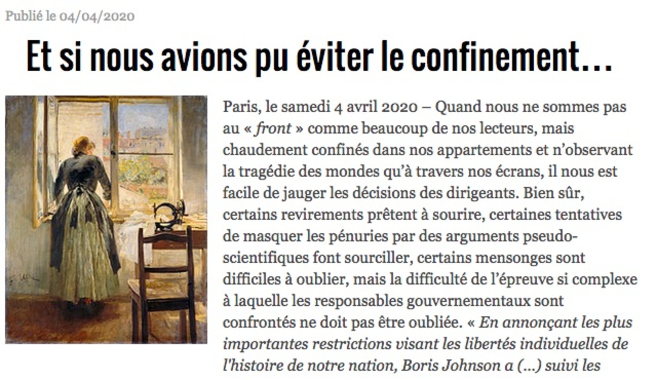 JIM n'est pas réputé pour ses analyses farfelues (ni son ouverture aux médecines alternatives, qu'ils attaquent constamment !) Sur le premier point, la journaliste s'interroge: « (..) partout à travers le monde, des médecins, des spécialistes constatent que des options différentes auraient pu être envisagées. » Et de citer une tribune publiée le 20 mars dans le New York Times par le fondateur du Centre de recherche en prévention de Yale-Griffin: « Nous distinguons régulièrement deux types d'actions militaires : le carnage (…) avec ses dommages collatéraux inévitables, et la précision d'une "frappe chirurgicale", ciblée méthodiquement (…). »La journaliste précise que « Dans cette approche « chirurgicale », le confinement strict ne concernerait que les sujets les plus à risque. » Car de toutes façons, « (..) au-delà de l’efficacité évidente de la distanciation sociale pour ralentir la circulation du virus, on ne peut ignorer totalement le rôle joué par l’évolution "naturelle" de l’épidémie. » Et de citer un médecin danois: « les taux de croissance quotidiens [de l’épidémie] ont diminué au fil du temps à des rythmes similaires dans des pays ayant des mesures très différentes. »