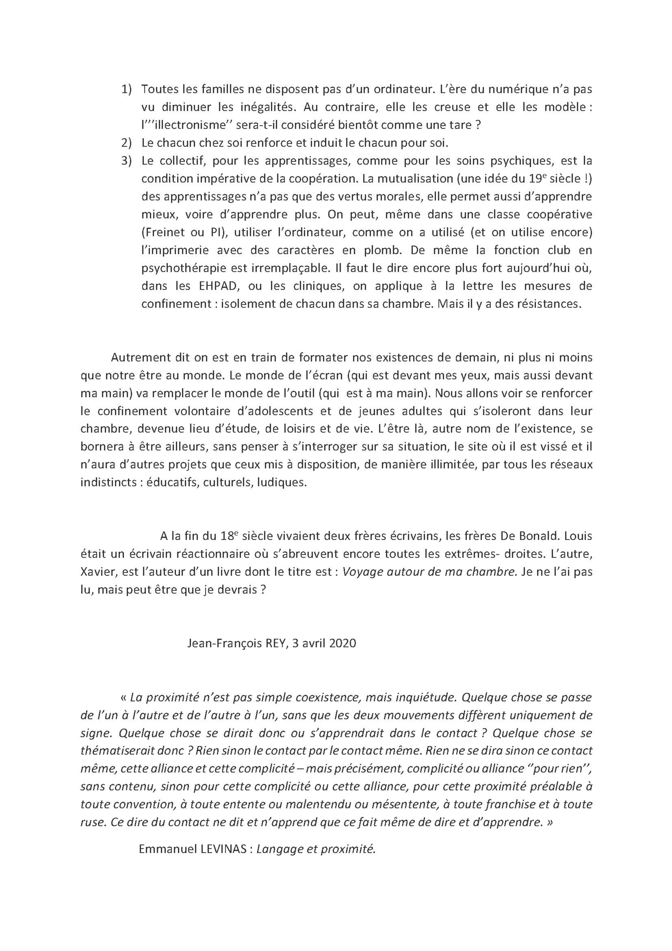 Une réflexion à rapprocher de celle d'un philosophe, Jean-François Rey que vous trouverez en pièce jointe, et qui s'achève par une extrait d'Emmanuel Lévinas sur la proximité et le rapport à l'autre. (Merci à Alain D. de me l'avoir transmis)