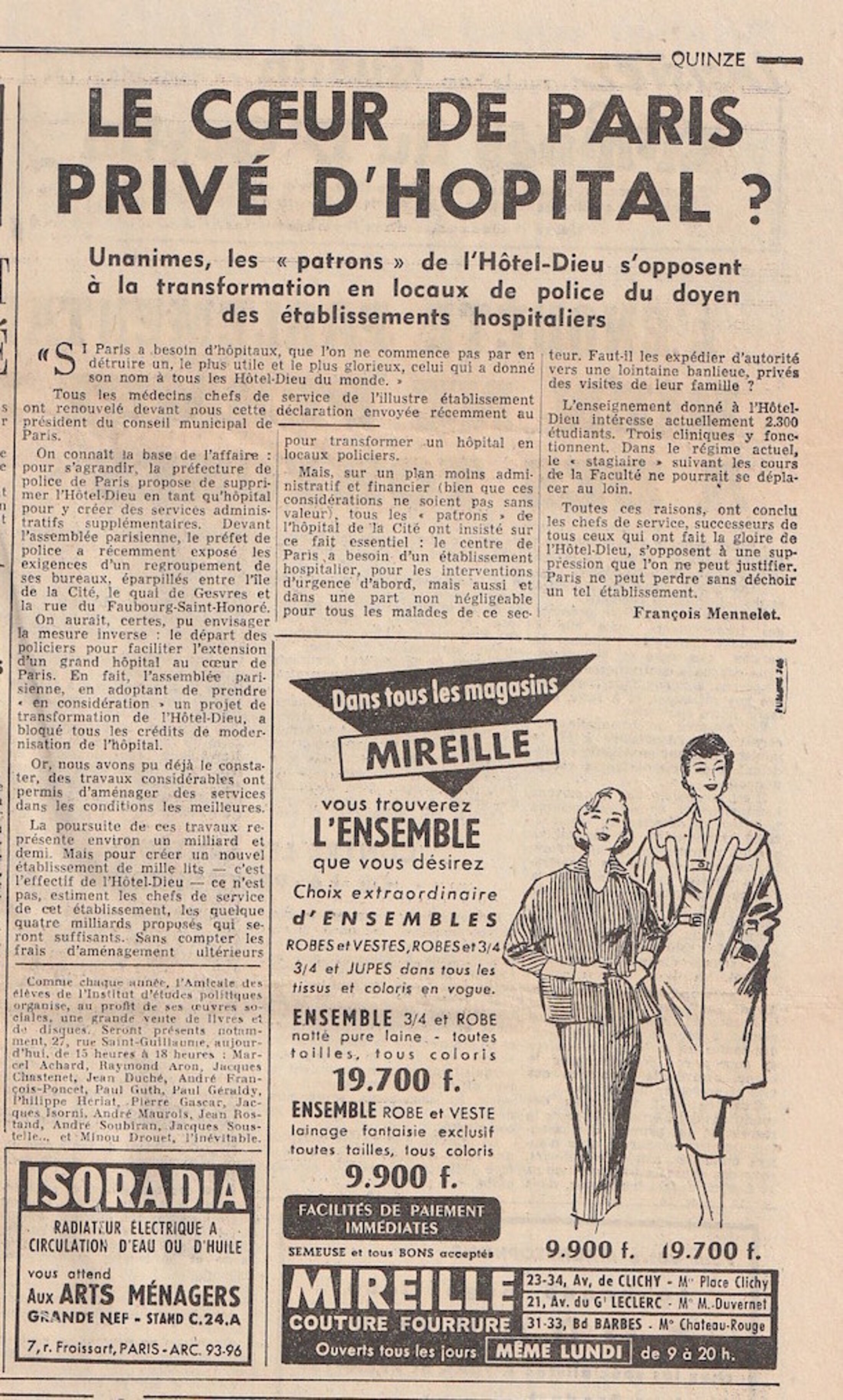 A Paris, le plus ancien hôpital parisien "a été fermé le 18 mars, pour être remplacé par un centre de dépistage du coronavirus à destination du personnel soignant" (L'Humanité, 24/4) Des médecins et des syndicats dénoncent ce choix, expliquant que la structure pourrait aider à prendre en charge des centaines de patients Covid". Le Directeur de l'AP-HP, Martin Hirsch, rétorque que les locaux ne sont pas conformes. L'article rappelle que les 60.000m2 du site ont de toutes façons déjà été vendus à la découpe il y a un an, 1/3 de la surface ayant été cédé à la société Novaxia pour créer un pôle santé, un pôle solidaire, un restaurant gastronomique, un café et des magasins. https://www.humanite.fr/lhotel-dieu-dans-lenfer-du-demantelement-688253 En pièce jointe, un article sur la crainte de la disparition de l'Hôtel-Dieu, écrit en.. 1957. C'était alors Le Figaro qui s'en alarmait..