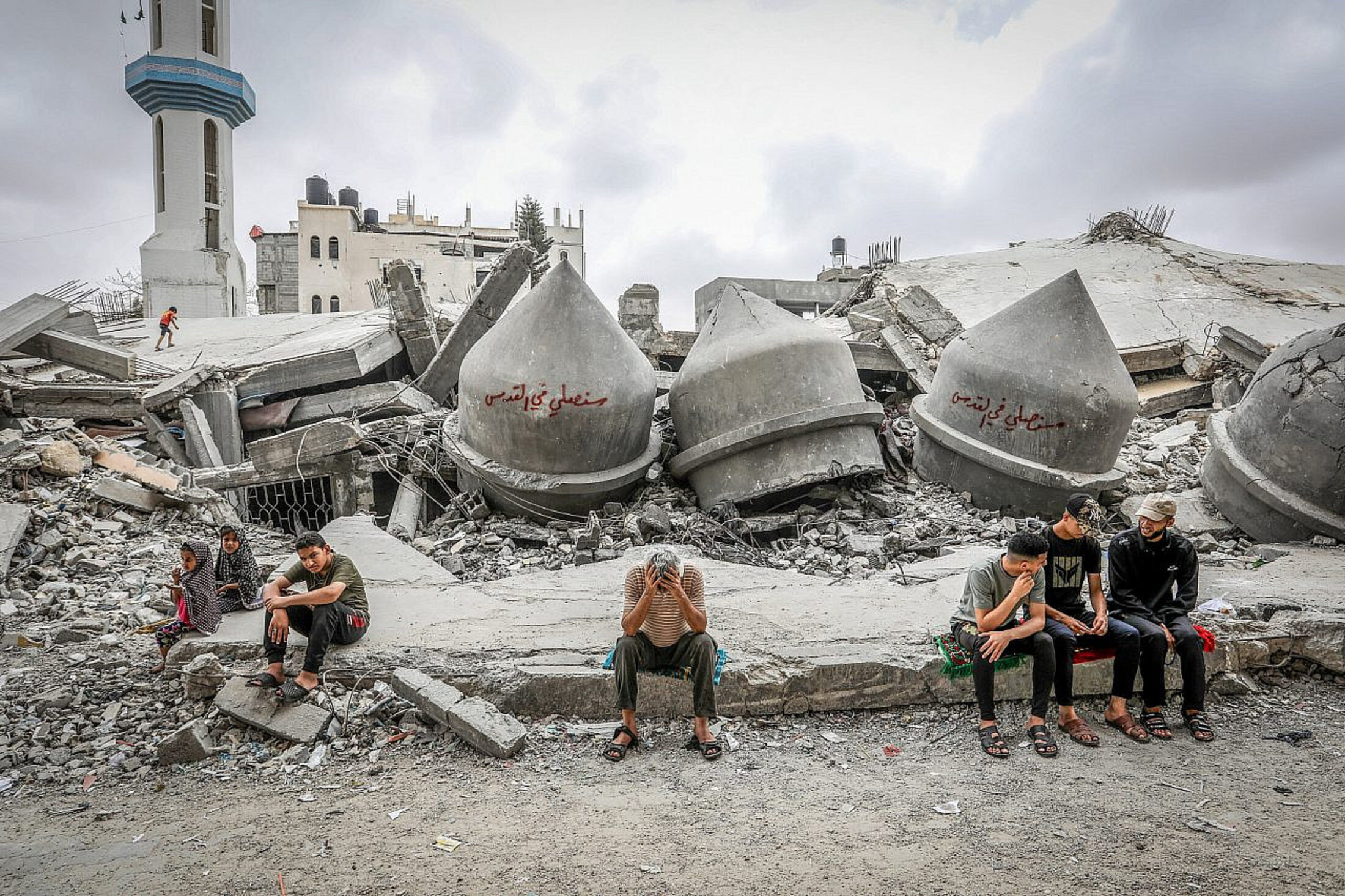 Des Palestiniens sur le site d’une mosquée détruite par une frappe aérienne israélienne, près du camp de réfugiés de Shaboura à Rafah, dans le sud de la bande de Gaza, le 26 avril 2024. (Abed Rahim Khatib/Flash90)