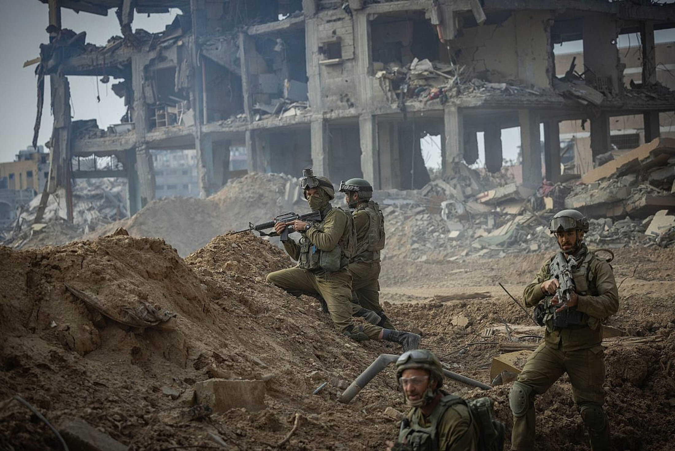 Des soldats israéliens du 8717e bataillon de la brigade Givati en opération à Beit Lahia, dans le nord de la bande de Gaza, le 28 décembre 2023. (Yonatan Sindel/Flash90)