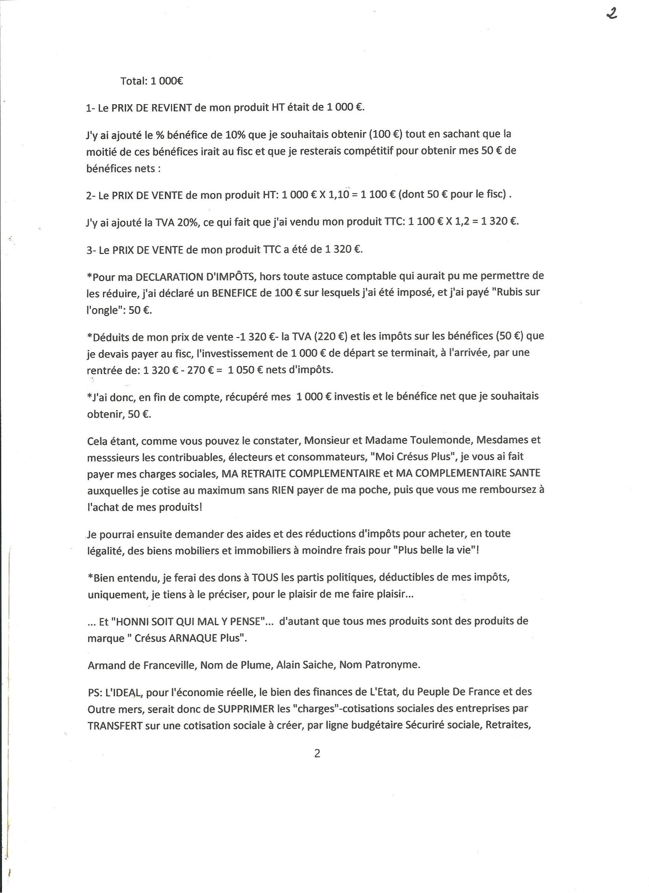 Le 21.05. 2016, j'ai demandé officiellement à François Hollande, Président de La République, par l'intermédiaire des réseaux Twitter et Facebook, de reconnaitre officiellement que les entreprises ne participent en RIEN au financement des recettes sociales de L'Etat France, au motif qu'elles incorporent toutes leurs cotisations sociales-charges dans les calculs des PRIX DE REVIENT et de vente et se les font rembourser intégralement, avec bénéfices, par les consommateurs-acheteurs, à l'achat de leurs produits et services.