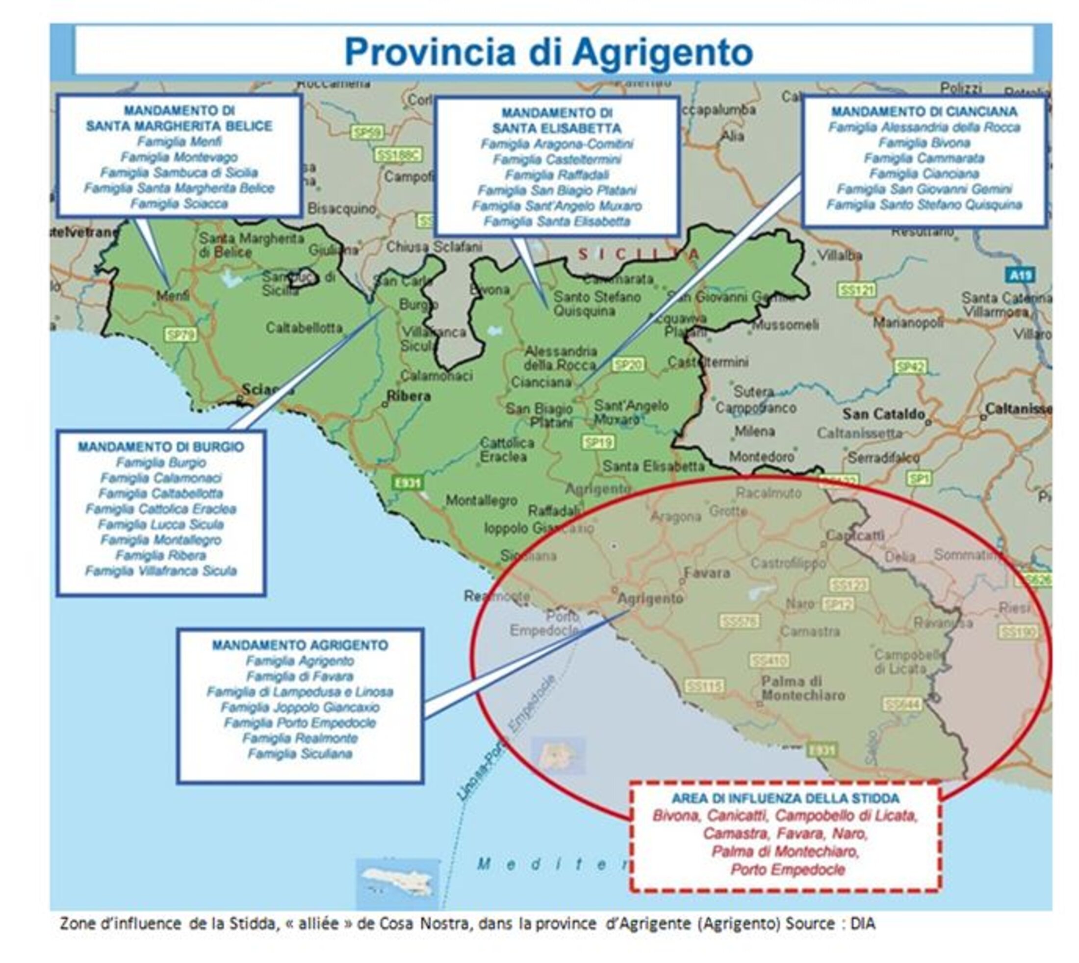 La mafia sicilienne compte 42 familles dans cette province, un nombre « particulièrement élevé, en rapport avec la taille du territoire et surtout en considérant que la Stidda joue un rôle d’appoint dans certaines zones de la province » In rapport de la DIA- deuxième semestre 2020, page 85.