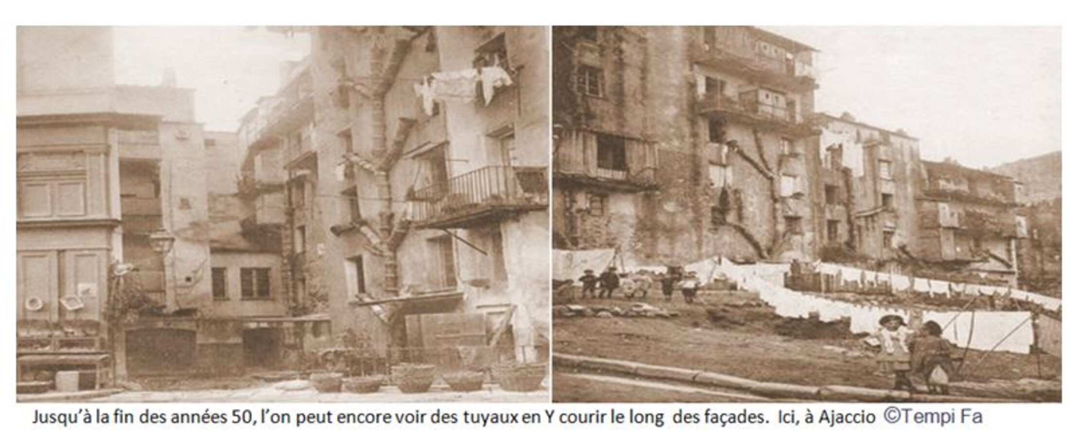 Jusqu’à la fin des années cinquante, début des années 60, sur les façades des vieux quartiers, l’on pouvait observer des tuyaux, en céramique, qui servaient à vider les « vases d’aisance ». Faute de cabinets dans les maisons, le transvasement s’effectuait au risque de « débordements » sur les passants. On peut déjà voir les premiers cabinets, installés à l’extérieur, en ajout sur certaines terrasses