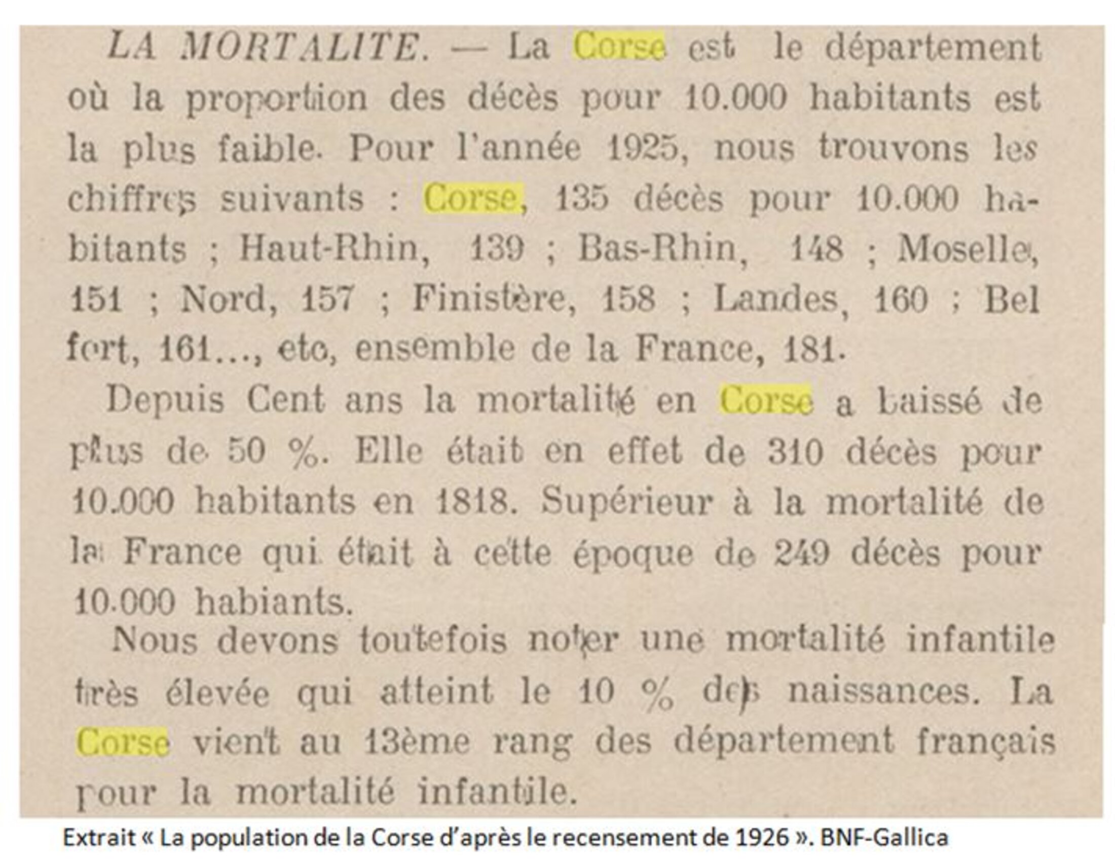 Dès le 19ème siècle, l’état de la Corse se distingue, en matière de santé publique. Le taux insulaire de natalité est supérieur à la moyenne nationale. Cependant, malgré une grande pauvreté, la mortalité infantile reste nettement inférieure et l’espérance de vie (33 ans) demeure supérieure à la moyenne de la France métropolitaine (29 ans). C’est du moins le constat que dresse l’ingénieur François Robiquet dans son rapport Recherches historiques et statistiques sur la Corse, publié en 1835. Son étude porte sur une période où l’île est « sur le fil du rasoir ». La situation économique et sociale va se détériorer, fin 19ème et début 20ème.