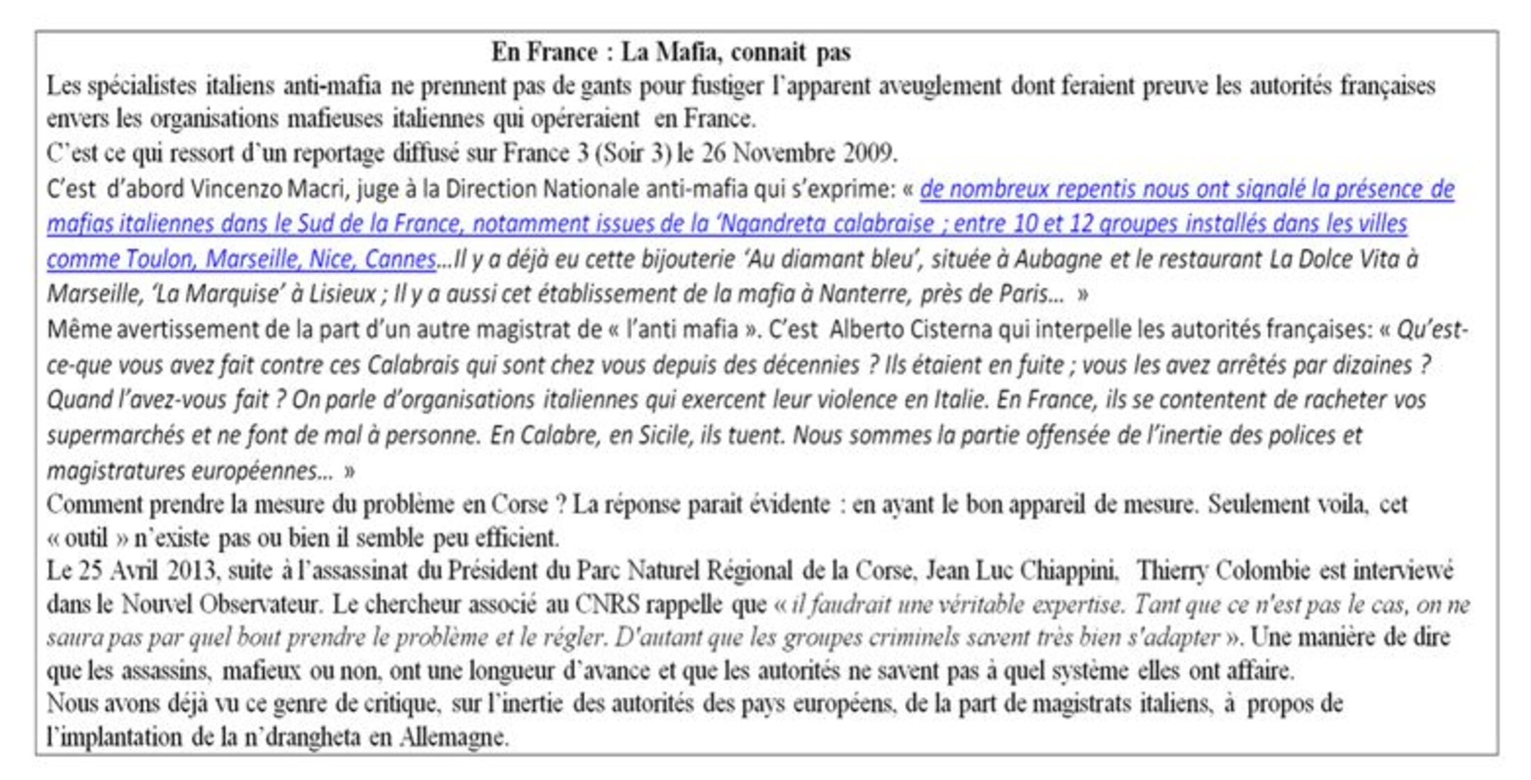« J’ai appris, en discutant, de manière officieuse, avec des officiers de police judiciaire, que la mafia calabraise est organisée selon un régime de loges - les cosche. Dans les Alpes-Maritimes, sept cosche sont établies, la cosca mère étant à Juan-les-Pins, et dépendent toutes de la cosca de Vintimille. Enzo Ciconte (*) cite trois raisons pour lesquelles le crime organisé a décidé d'entrer en maçonnerie : intégrer le tissu économique local, avoir des liens au sein des institutions et approcher les magistrats. [...] » . Visiblement, près de 23 ans après ces propos, les choses (législation, enquêtes…) semblent bouger lentement.