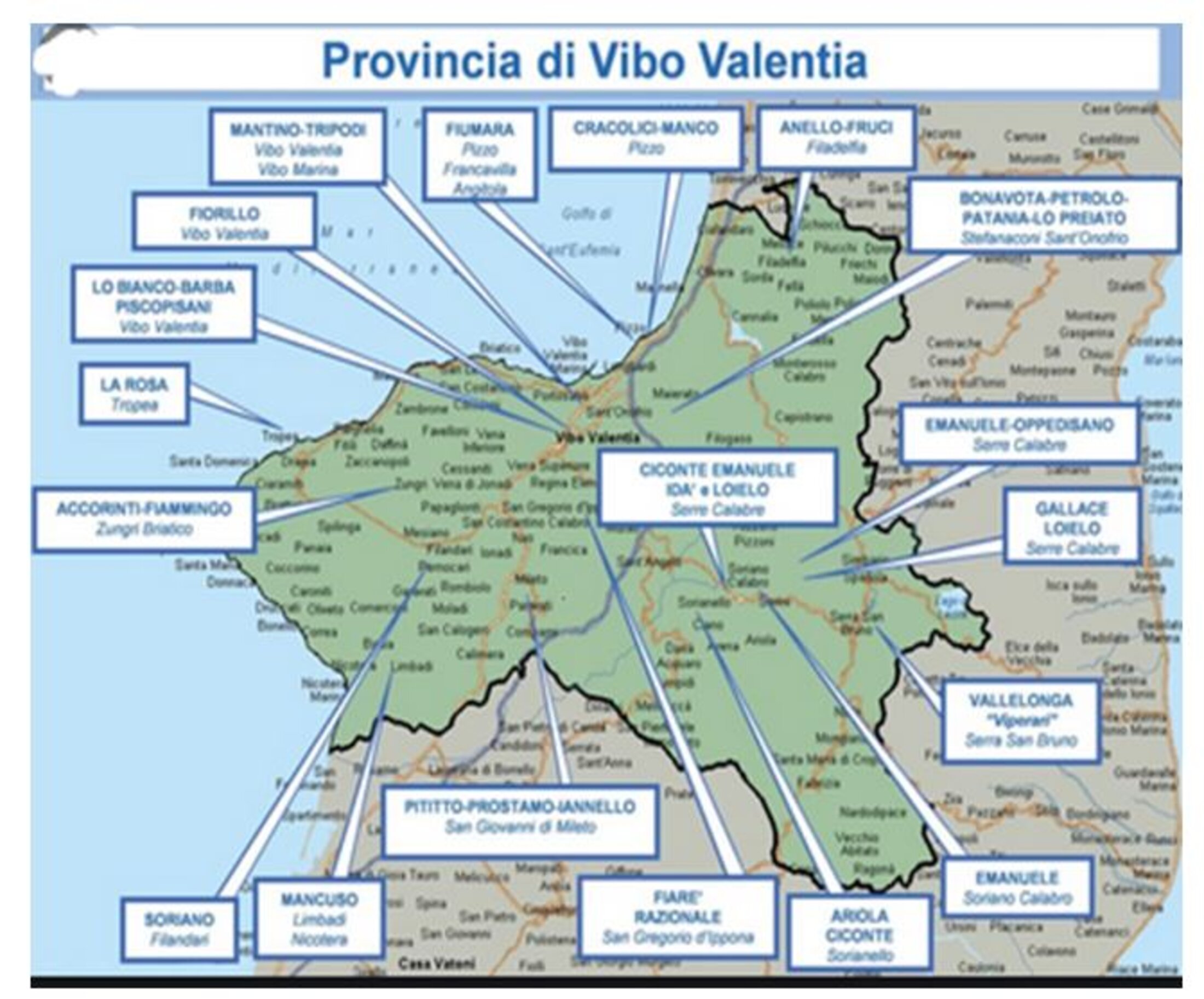 L’emprise de la ‘Ndangheta peut se comprendre en observant la carte ci-dessous, Source DIA (Direzione Investigativa Antimafia). On y voit la localisation des différentes familles mafieuses pour la seule province de Vibo Valentia. Dix-neuf (19) 'ndrine (familles ou groupes de familles mafieuses) se partagent le territoire de cette province. La Calabre (1 million 900 000 habitants) compte cinq provinces (l’équivalent de nos départements). Celle de Vibo Valentia compte 165 500 hab.
