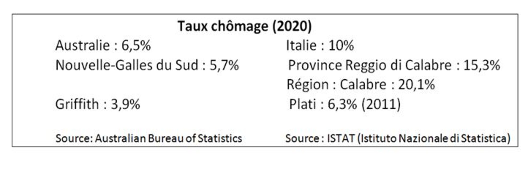 En matière d’emplois, la comparaison entre la Calabre et la nouvelle-Galles du Sud (Australie) est édifiante. En 2020, cette région italienne est celle qui a perdu le plus d’emplois en Italie. L’écart des taux de chômage entre l’Italie et l’Australie est important, du niveau national au niveau local, en passant par le niveau régional. Plusieurs articles de presse parlent « d’un habitant de Plati, sur deux, sans emploi ». Le nombre parait excessif. Il m’a été impossible de trouver le taux de chômage de Plati pour 2020, le dernier publié remonte à 2011. Cette commune dépend de la province de Reggio di Calabre.