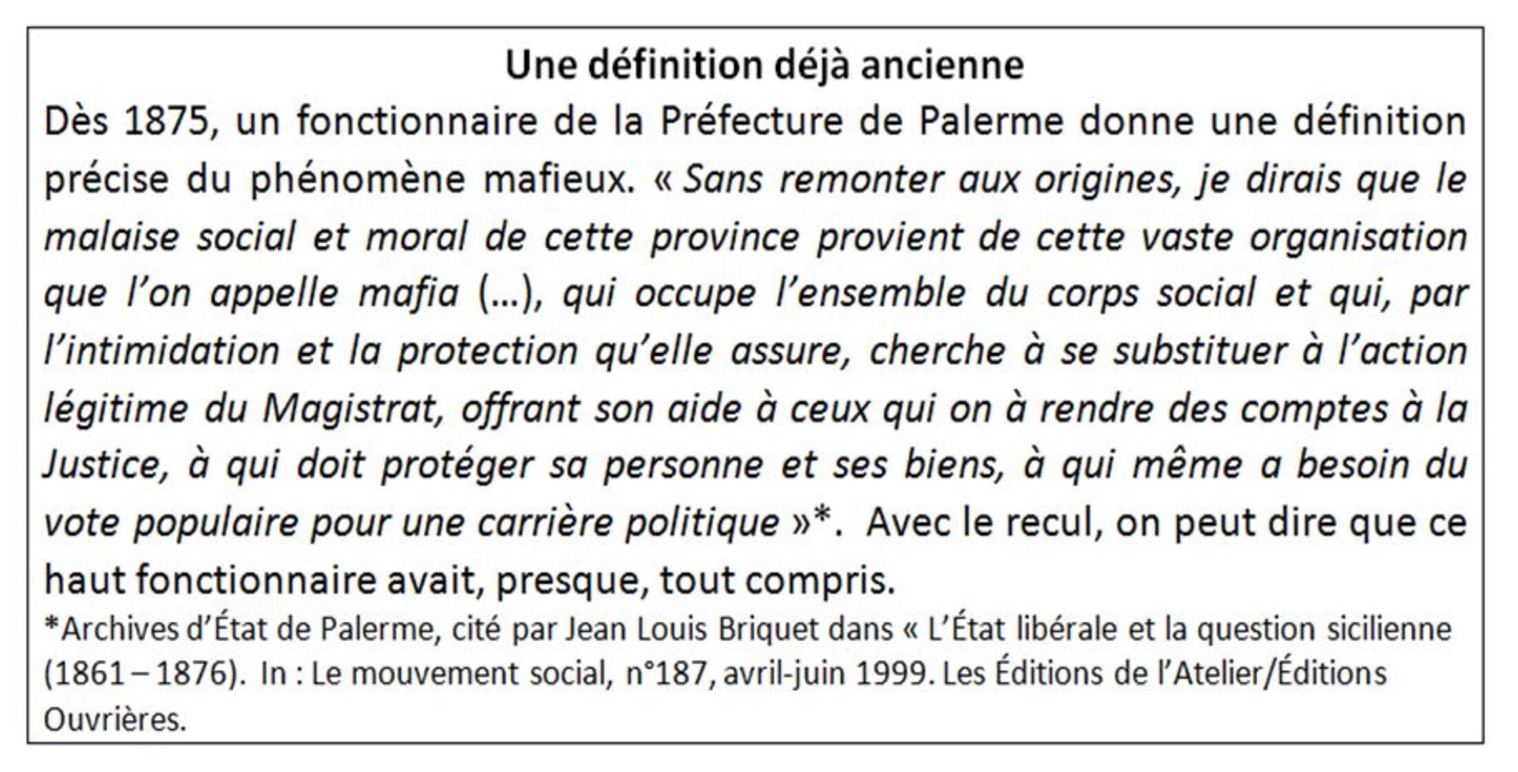 L’Italie a reconnu l’existence d’organisations mafieuse, par étapes, à partir du 19ème siècle. Dès cette époque, des enquêtes parlementaires, et policières citent l’existence d’organisations criminelles, dans le sud du pays. Les appellations régionales apparaissent dès le 19ème siècle : Camorra (Naples/Campanie), ‘drangheta (Calabre). En Sicile, alors qu’une « organisation » est identifiée dès le 19ème siècle, le mot longtemps employé par les personnes extérieures à l’organisation sera « Mafia ». Un mot que les membres du groupe criminel n’utilisent pas entre eux. Le terme de Cosa Nostra, bien que circulant de longue date (à l’intérieur de l’Organisation), ne sera confirmé qu’au milieu du 20ème siècle par les « repentis ».