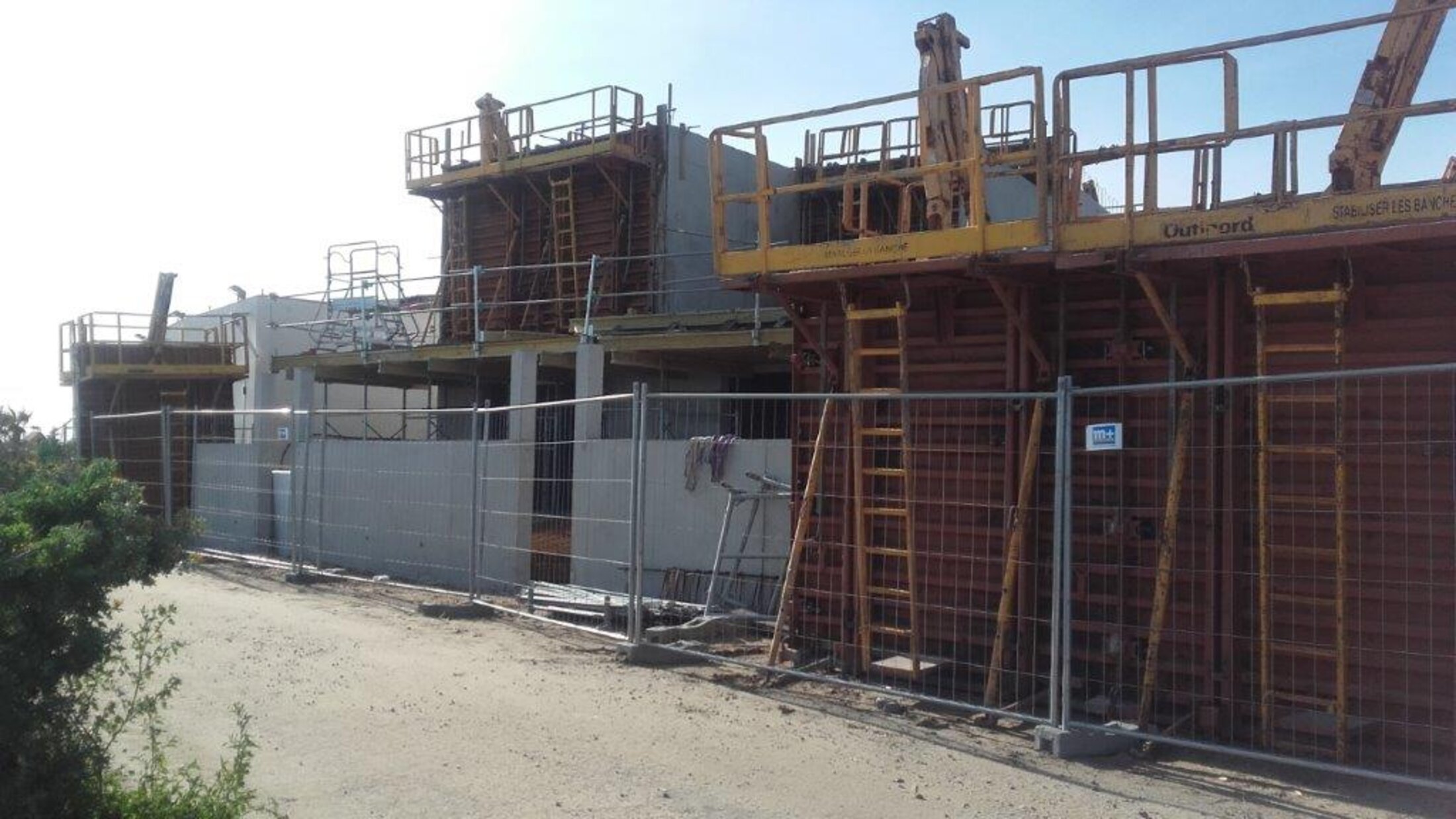 La dalle est terminée. Les murs du dernier étage montent. Le chantier continue. Les escaliers de l'immeuble sont terminés.