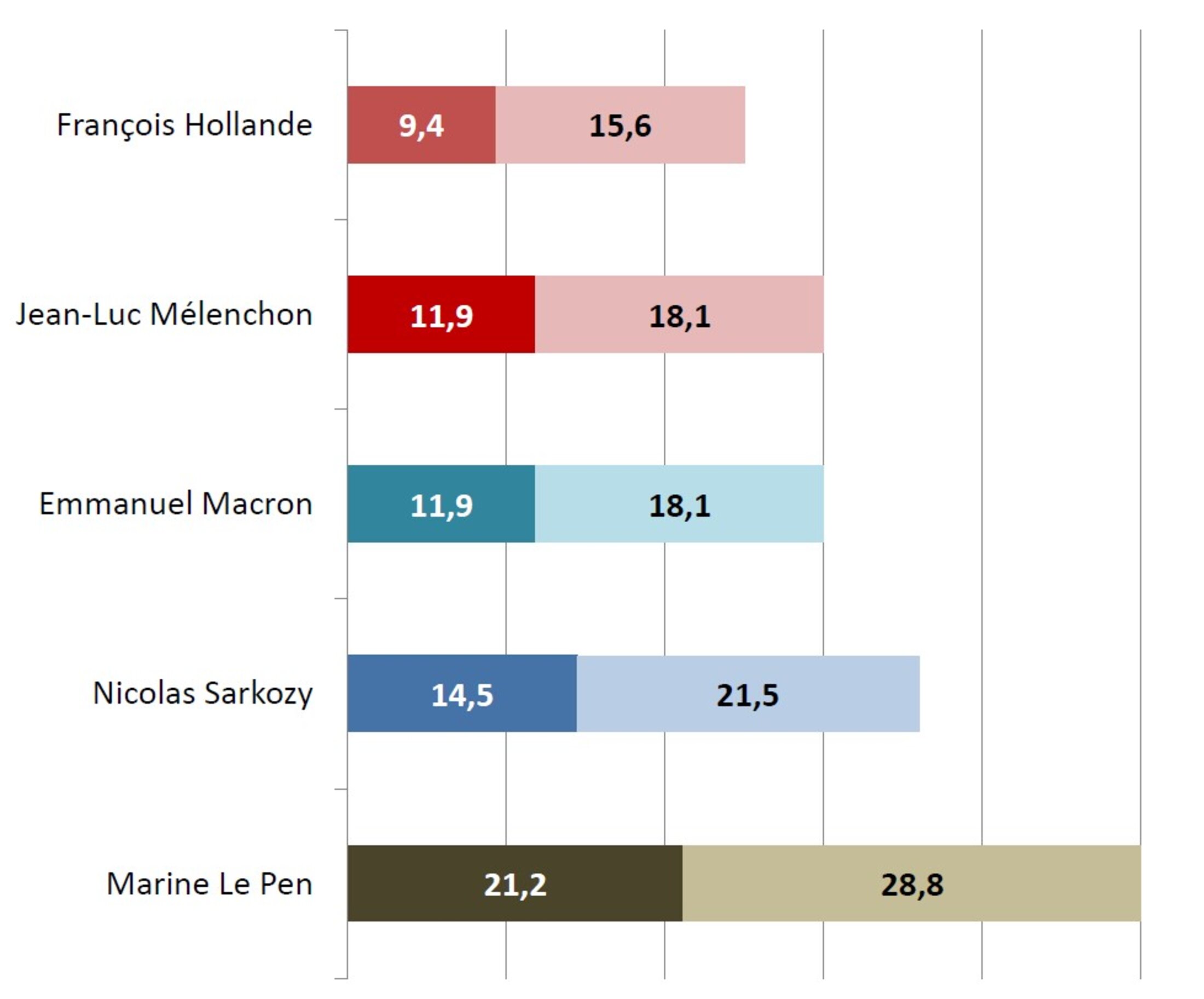 En somme, si un second tour Le Pen/Sarkozy est du domaine du possible, d’autres scénarios de second tour sont crédibles. Marine Le Pen est assurée d’être présente au second tour, car un seul candidat, Nicolas Sarkozy, obtient un potentiel maximum d’intention de vote dépassant son propre minimum potentiel. Mais le challenger de la candidate d’extrême-droite peut tout aussi bien être Emmanuel Macron, Jean-Luc Mélenchon ou François Hollande. Pourtant, dans le sondage en question, aucun scénario de second tour Le Pen/Macron, Le Pen/Mélenchon ou Le Pen/Hollande n’est testé… Cela aurait pourtant sans doute été intéressant !