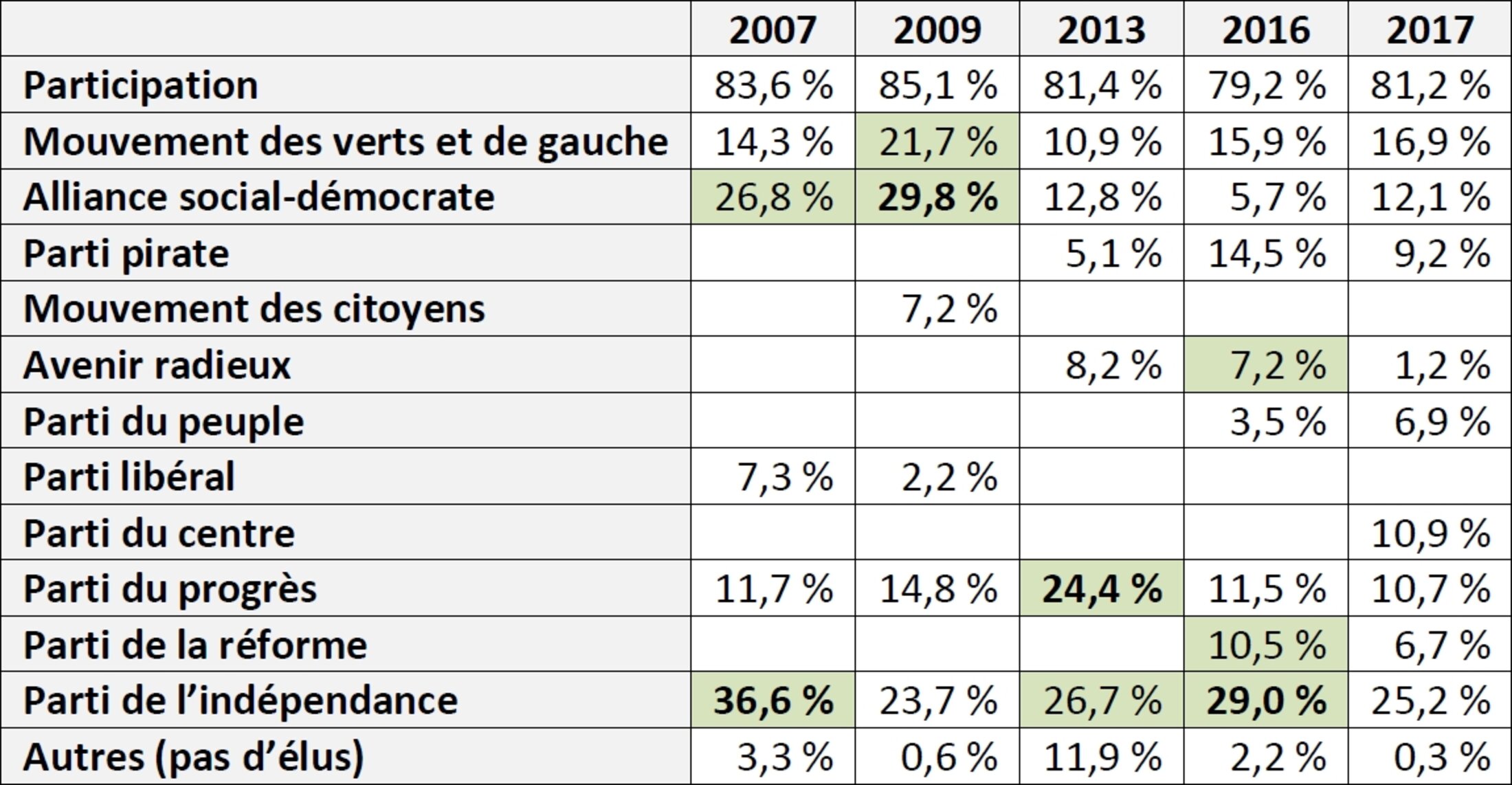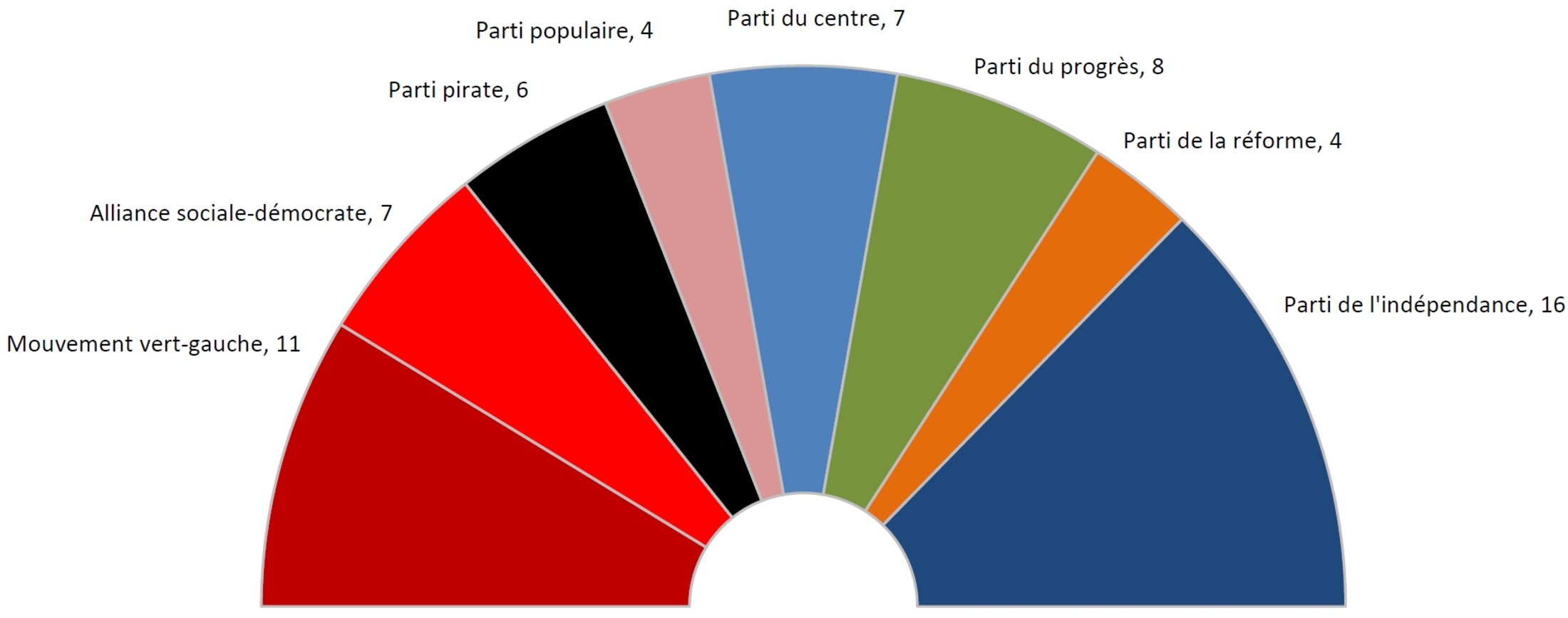 Cette grande confusion se retrouvera dans les urnes. Les islandais semblent y trouver de l'intérêt : la participation, en hausse, atteint 81,2 % ! Le Parti de l'indépendance, malgré sa kyrielle de casseroles, demeure envers et contre tout le premier parti d'Islande. Mais il ne rassemble plus gère qu'un quart des suffrages exprimés. Il est suivi, de loin, par le Mouvement des verts et de gauche, qui avec 16,9 % fait beaucoup moins bien qu'attendu. Vienne ensuite l'Alliance social-démocrate, en relatif revival (12,1 %), le Parti du centre (10,9 %, la scission a donc été un franc succès), le Parti du progrès (10,7 %), le Parti pirate (9,2 %) et le Parti de la réforme (6,7 %). Un huitième larron s'invite sur les bancs de l'Althing, le Parti du peuple (6,9 %). Fondé par Inga Sæland, ancienne candidate de l'émission de TV X-Factor, ce parti fondé en 2016 axait à l'origine son discours sur la lutte contre la pauvreté. Inga Sæland a plus tard tenu des discours xénophobes et anti-immigrés qui ont généré une importante polémique, amenant la principale intéressée à rétropédaler, affirmant même être favorable à l'accueil des réfugiés moyen-orientaux. Avenir radieux, durement jugé par ses électeurs pour son alliance avec le Parti de l'indépendance dans le gouvernement sortant, est laminé (1,2 %).