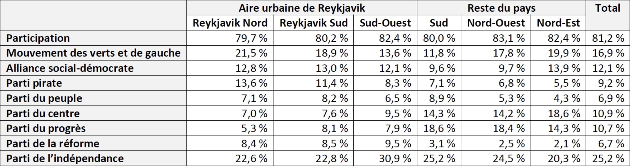 La géographie électorale des différents partis reste très stéréotypée. Le Parti de l'indépendance jouit d'une implantation assez homogène sur l'ensemble du pays, pouvant compter à la fois sur les couches supérieures de la société liées aux milieux d'affaires de Reykjavík comme sur les populations rurales dépendantes de l'agriculture et de l'industrie de la pêche, inquiètes de la mise en place de quotas en cas d'adhésion à l'Union européenne. Les partis de gauche (le Parti pirate en particulier) peuvent compter sur des soutiens importants en milieu urbain, dans l'agglomération de la capitale mais aussi dans le nord-est où se trouve Akureyri, 17.000 habitants, première ville d'Islande en dehors de l'aire urbaine de Reykjavík. Leurs résultats sont plus modestes dans les zones rurales, quoique le VG bénéficie d'une implantation ancienne dans le nord-ouest. Le Parti du progrès, faible dans les circonscriptions urbaines (entre 5,3 et 8,1 %) est en revanche très puissant dans les circonscriptions rurales. Près d'un siècle après sa création par des partis de défense des intérêts des paysans, ce parti reste donc une référence pour les agriculteurs et leurs familles. Il est cependant directement concurrencé auprès de son cœur de cible par le Parti du centre, qui jouit d'une implantation électorale analogue. Le Parti de la réforme concentre tous ses électeurs europhiles dans l'aire urbaine de Reykjavík et reste marginal dans le reste du pays. Enfin le Parti du peuple obtient des résultats plutôt homogènes, malgré une faiblesse assez marquée dans les circonscriptions rurales du nord.