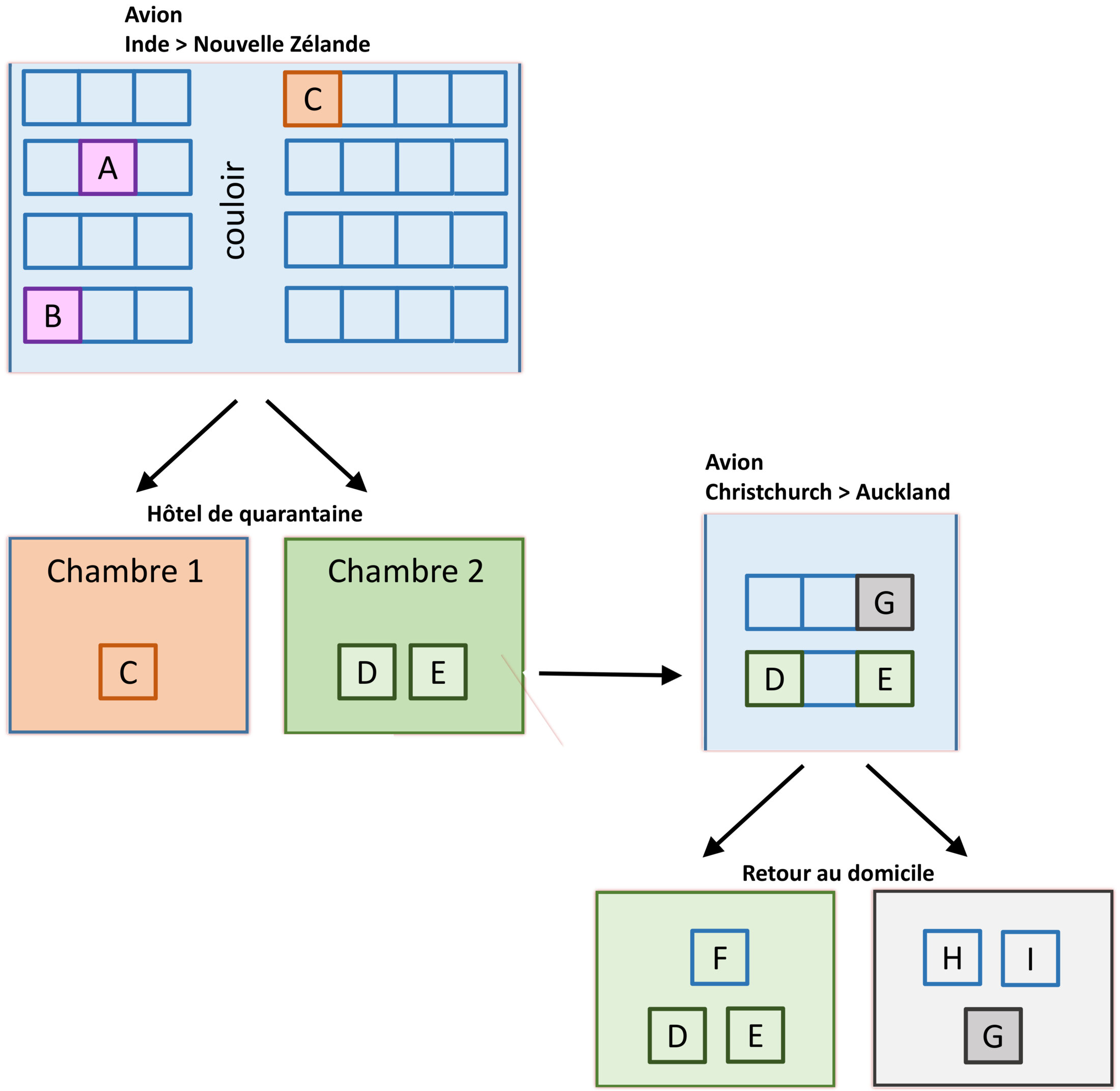 A la fin de la quarantaine, A (guéri), D et E (testés négatif et sans symptômes) et la personne G prennent un même vol de Christchurch vers Auckland (85 min de vol, masques obligatoires, 50%) d'occupation. G est assis devant D/E. A est loin. G retrouve les personnes H et I chez lui. D et E retrouvent F chez eux.