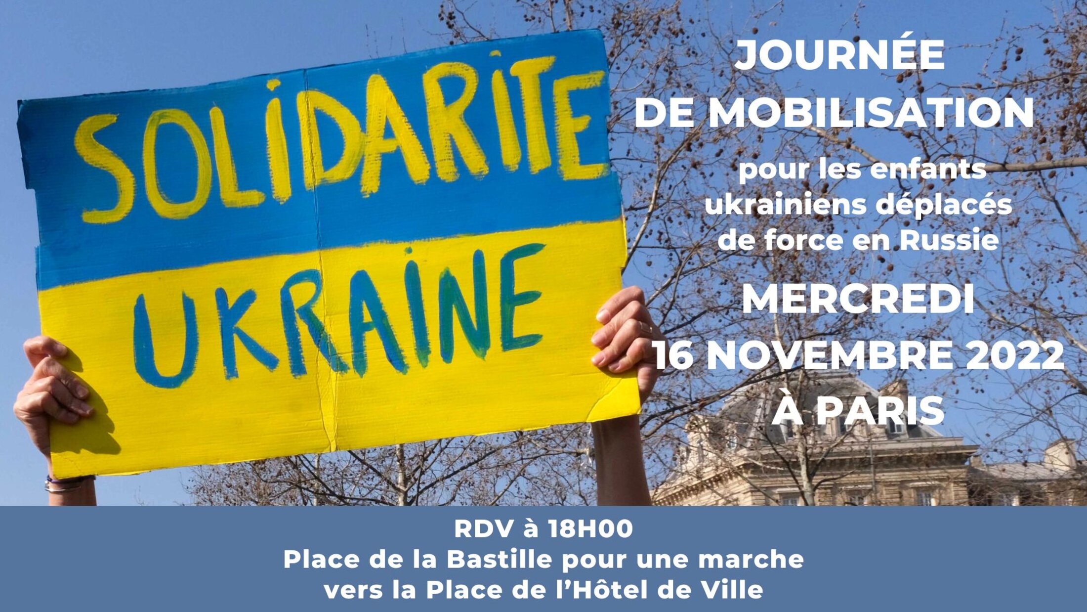 Mercredi 18 Novembre Journée de mobilisation pour les enfants ukrainiens déplacés de force en Russie Paris Place de la Bastille 18H Marche vers la Place de l’Hôtel de Ville