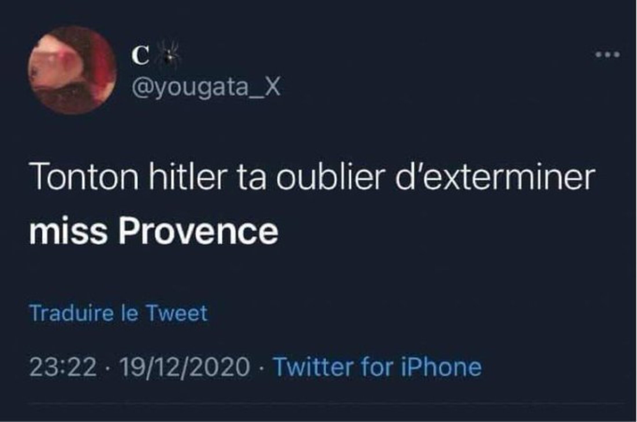 Tous les clichés antisémites amalgamés à l’antisionisme se trouvent dans son texte: si April Benyaoum, Miss Provence, a été insultée et menacée en référence à Hitler, c'est bien sûr de sa faute