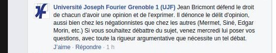 Mais son prestige de scientifique et d'"intellectuel" lui permet d'être invité à l'université par ses pairs.qui défendent cette invitation au motif que Mr Bricmont dénoncerait le « délit d'opinion chez les négationnistes comme chez les autres ». Du moins, c'est la réponse qui a été faite par l'Université sur son compte Facebook . Voici donc le négationnisme intronisé par la direction d'une université comme une opinion parmi d'autres, ni plus, ni moins....et l'Université serait donc un lieu qui n'aurait pas à trancher entre diverses « opinions », qui se valent toutes.