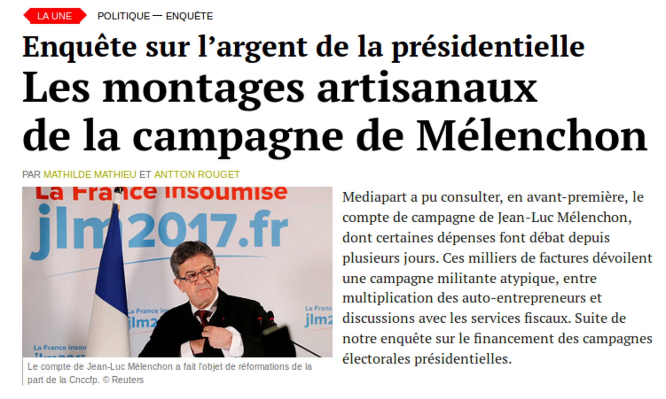 Nous avons donc tous les ingrédients sur cet article : Les montages artisanaux de la campagne de Mélenchon, un titre accrocheur et une photo qui permet de marteler l'idée que la campagne électorale de France Insoumise ne serait qu'une vaste magouille. Il est à noter que sur Médiapart seuls les abonnés peuvent consulter les articles, alors que les visites des "non abonnés" doivent être très nombreuses et que ces derniers ne verront que le titre et la photo :