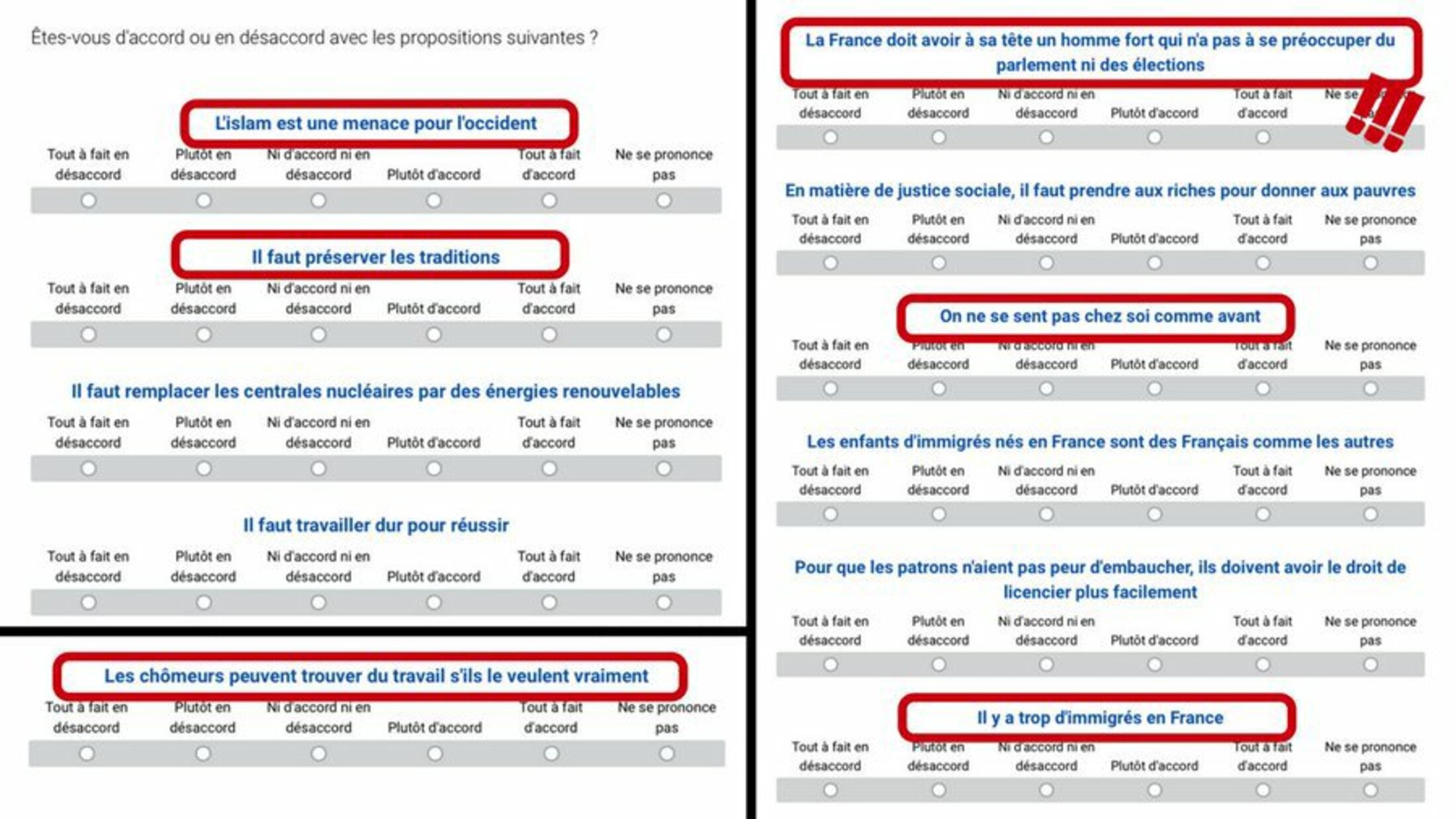 En plus des questions sur la menace islamique, on trouve d’autres affirmations sur lesquelles les militants sont invités à montrer leur accord ou désaccord : « On ne se sent pas chez soi comme avant », « Les enfants d’immigrés nés en France sont des Français comme les autres » ou encore « Il y a trop d’immigrés en France »…