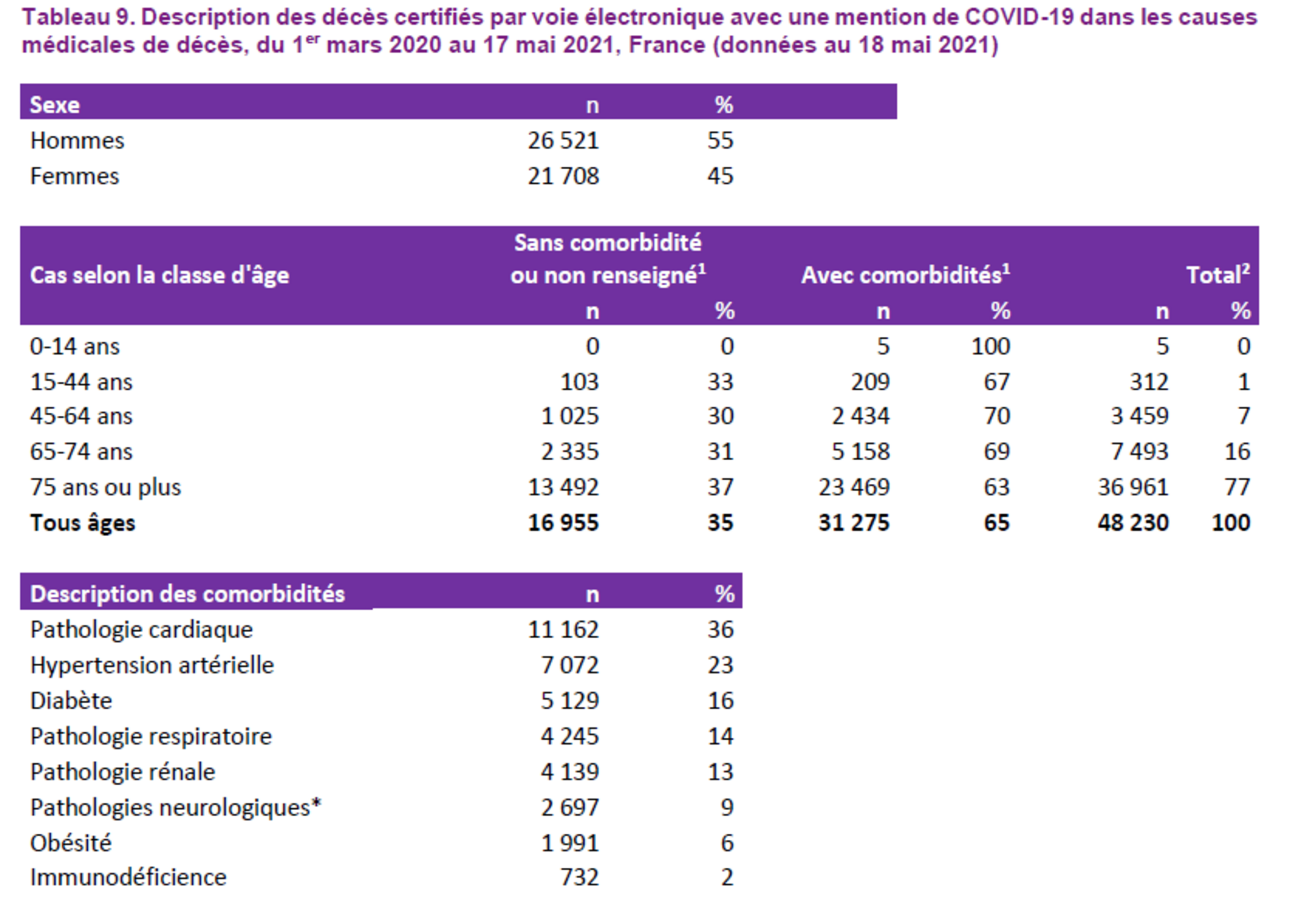 Oui, ce virus peut être mortel. Les données de Santé Publique France, même fausses, en attestent. En attestent aussi les soignants qui voient mourir depuis des années le système de santé. Voyons les chiffres rectifiés communiqués publiquement par l’organisme. Du 1er mars 2020 au 17 mai 2021, soit sur plus de 13 mois glissants, on dénombre 48 230 décès liés à la COVID 19, dont 31 275 avec des comorbidités. C’est-à-dire que d’autres facteurs, parfois multiples, sont responsables du décès de ces individus. Au total, 16 955 personnes sont décédées « sans comorbidité ou non renseigné ». Valeur haute : 0,025% de la population française. Les statistiques de Santé Publique France rapportent que 79,58% de ces personnes décédées ont plus de 75 ans. Une étude plus fine permettrait, évidemment, de cibler la tranche d’âge moyenne la plus à risque. On peut parier sur plus de 80 ans, soit l’espérance de vie dans notre pays, à notre époque. Claude Janvier, co-auteur de « Le virus et le président : enquête sur l’une des plus grandes tromperies de l’Histoire », chez IS Edition, précise même « L’âge moyen des décès par la Covid-19 est de 82 ans, l’âge médian étant de 85 ans. La surmortalité due à la Covid-19 est négligeable pour les personnes de moins de 65 ans. »