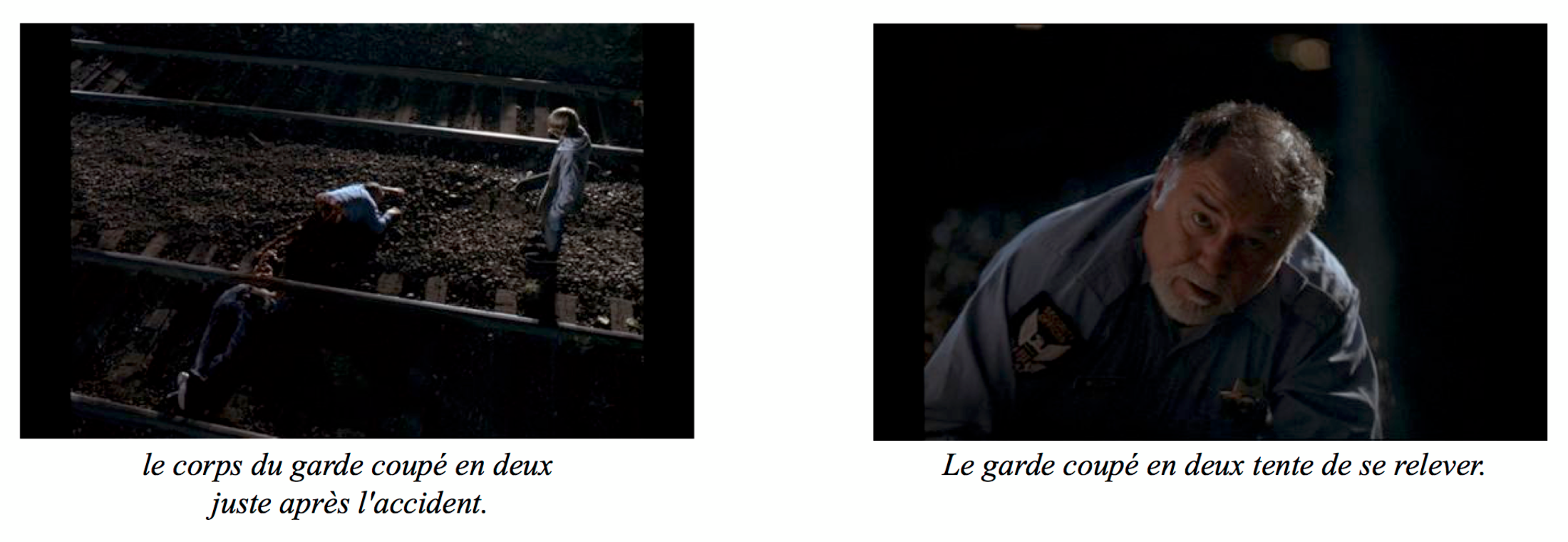 Image improbable, incroyable, irréelle2, que ce corps coupé en deux. Une image traitée façon gore par le réalisateur, pourtant généralement peu adepte d'effets spéciaux, que ce soit dans ses autres films ou dans celui-ci. Une image qui tranche avec le réalisme du film et fait basculer le spectateur dans un autre registre. Comme l'évocation d'une autre scène. Comme s'il s'agissait d'une image psychique créée par le cerveau d'Alex. Les jambes inertes sur le basalte – et ce qui reste vivant, le buste, les bras, la tête du gardien. Moitié d'homme absurde, qui tente de se relever sur des jambes qui n'y sont plus, et qui regarde Alex.