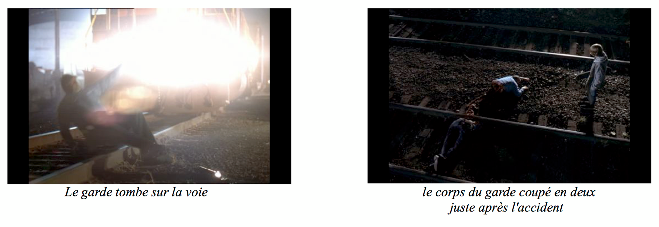 La scène de l'accident est pleine d'incohérences, comme dans un rêve. Le buste du garde passe sous le train, mais ce sont ses jambes qu'on retrouve entre les rails. Une faute de raccord tellement énorme qu'on a du mal à croire qu'elle ne soit pas intentionnelle. Le corps du garde est sectionné net comme un saucisson. Section de laquelle dégouline juste un boyau. Au-delà de l’invraisemblance d'une telle section, la manière dont le corps chute sur la voie la rend impossible. Le garde est toujours vivant et conscient après être passé sous son train. Son visage qui tente de se relever vers Alex est propre et net, émergeant comme d'un rêve, ayant juste perdu sa casquette lorsque le train de marchandises lui est passé dessus. Aussi, le policier dispose de toutes les évidences pour inculper Alex. Il a retrouvé son skate avec l'ADN de la victime dessus, il a des témoins... Mais il ne se soucie pas d'inculper Alex, ce n'est pas le problème. Il l'interroge une fois, soupire et s'en va. Comme s'il était juste venu lui mettre sous le nez cette image de corps coupé en deux...