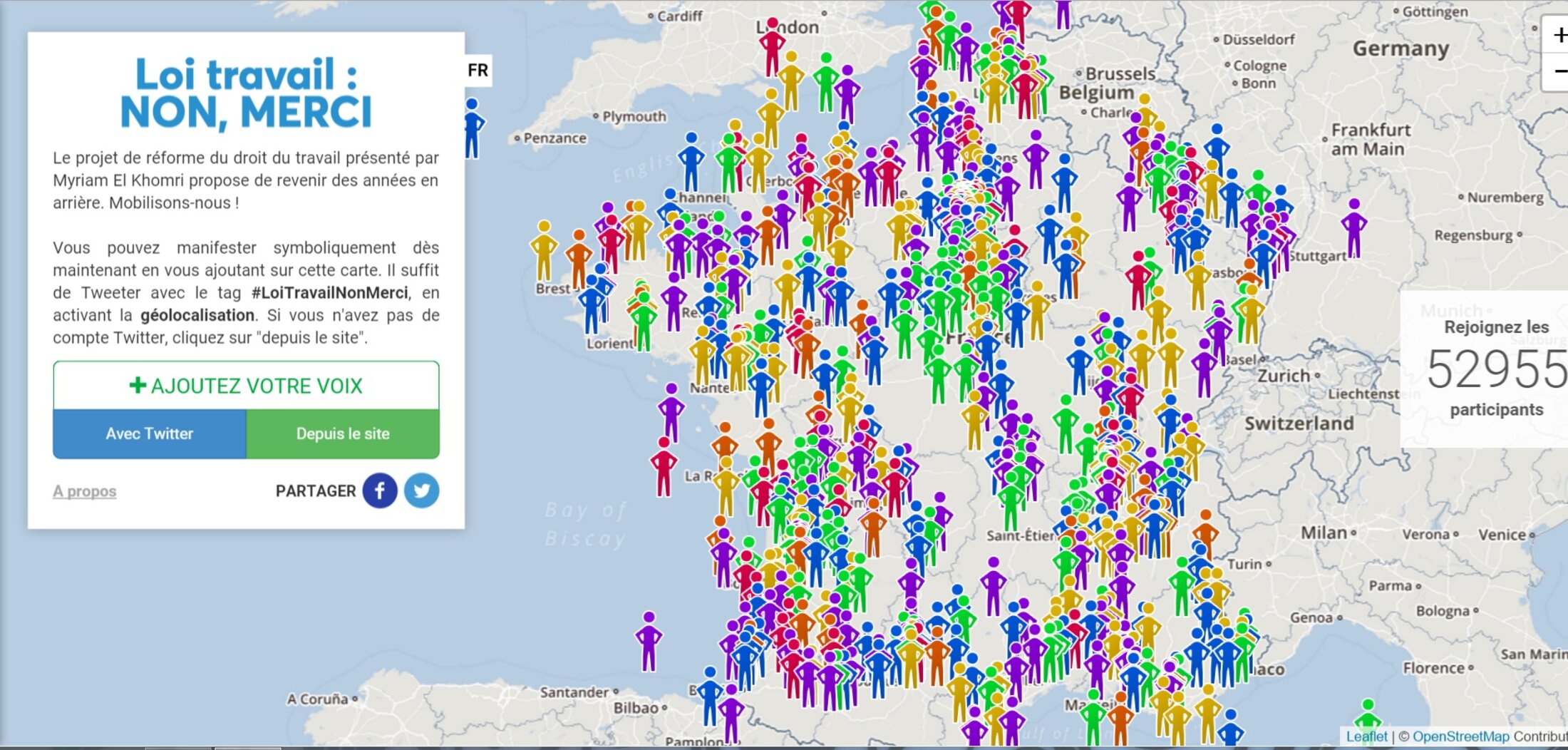 Au cours du direct, Elliot Lepers, ancien directeur de campagne numérique d’Eva Joly, a présenté l’une des fonctionnalités, et pas des moindres, de la page web loitravail.lol. Suite à une authentification via Twitter ou loitravail.lol, il est possible de manifester virtuellement et de s’exprimer par un Tweet.