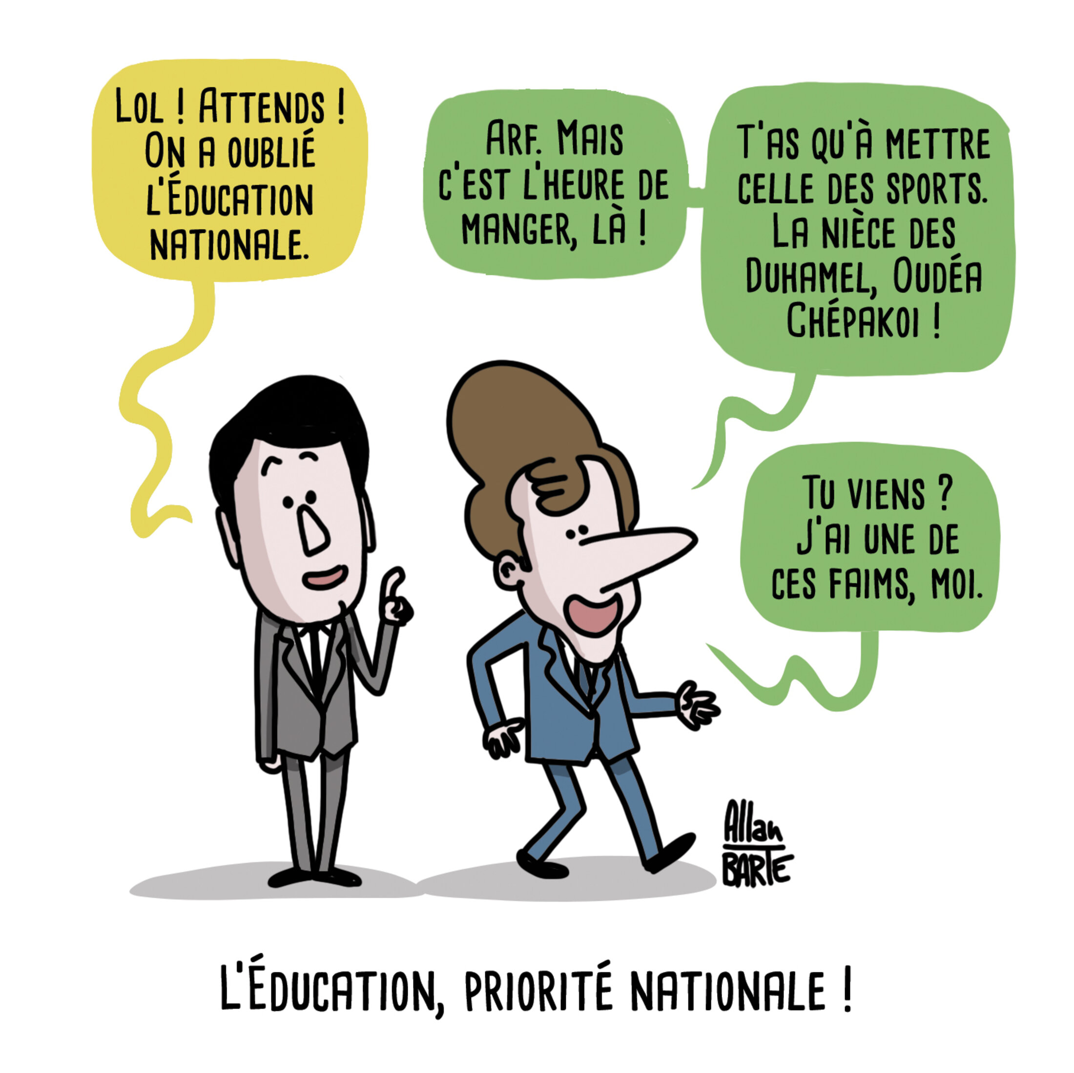 Attal réalisant soudain : - Lol ! Attends ! On a oublié l’Éducation nationale. Macron, s'éloignant déjà : - Arf. Mais c’est l’heure de manger, là ! - T’as qu’à mettre celle des sports. La nièce des Duhamel, Oudéa Chépakoi ! - Tu viens ? J'ai une de ces faims, moi. Titre : l’Éducation, priorité nationale