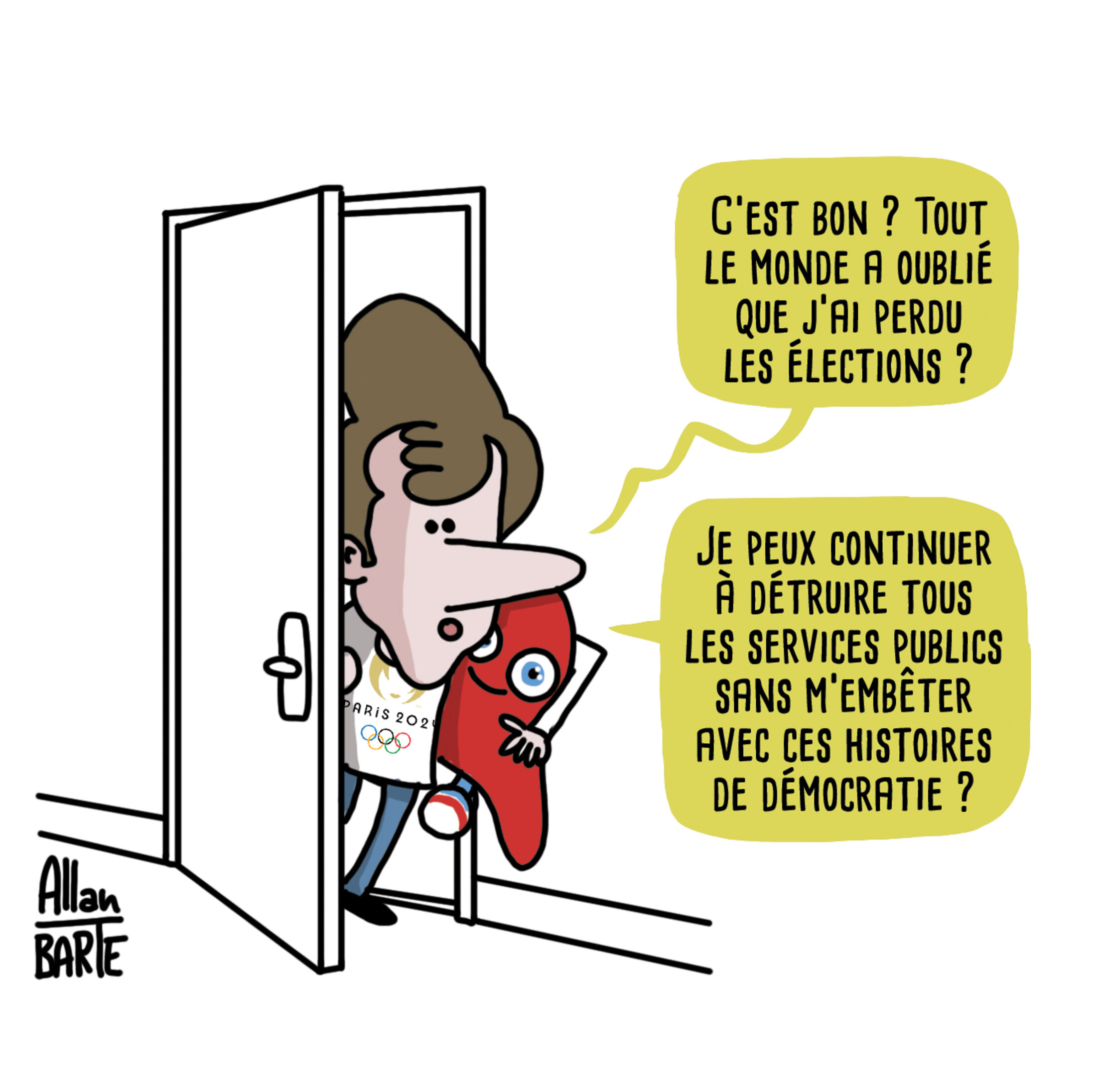 Macron, derrière une porte, T-shirt Paris 2024 et mascotte des JO sous le bras, passe la tête : - C’est bon ? Tout le monde a oublié que j’ai perdu les élections ? - Je peux continuer à détruire tous les services publics sans m’embêter avec ces histoires de démocratie ?