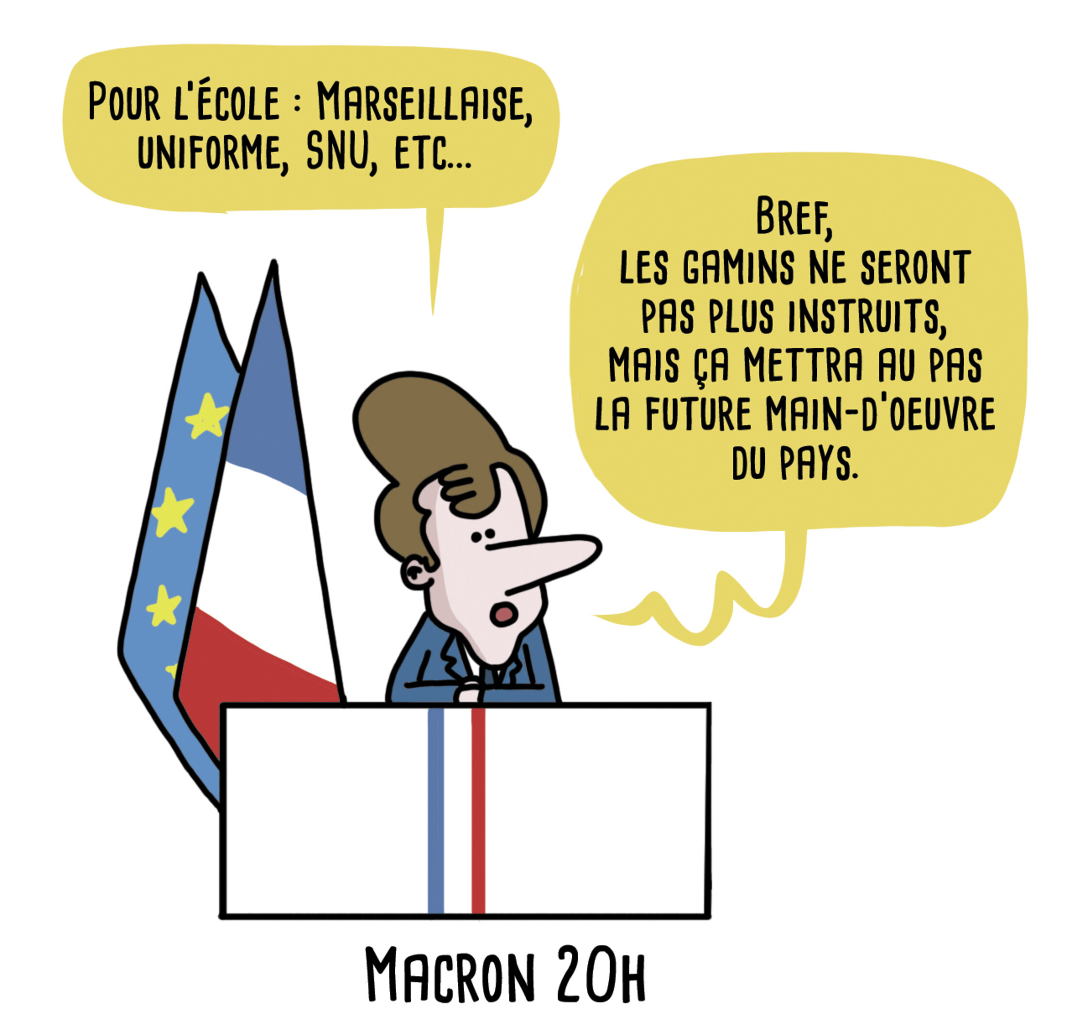 Macron à son pupitre: - Pour l’école : Marseillaise, uniforme, SNU, etc... - Bref,les gamins ne seront pas plus instruits, mais ça mettra au pas la future main-d’œuvre du pays.