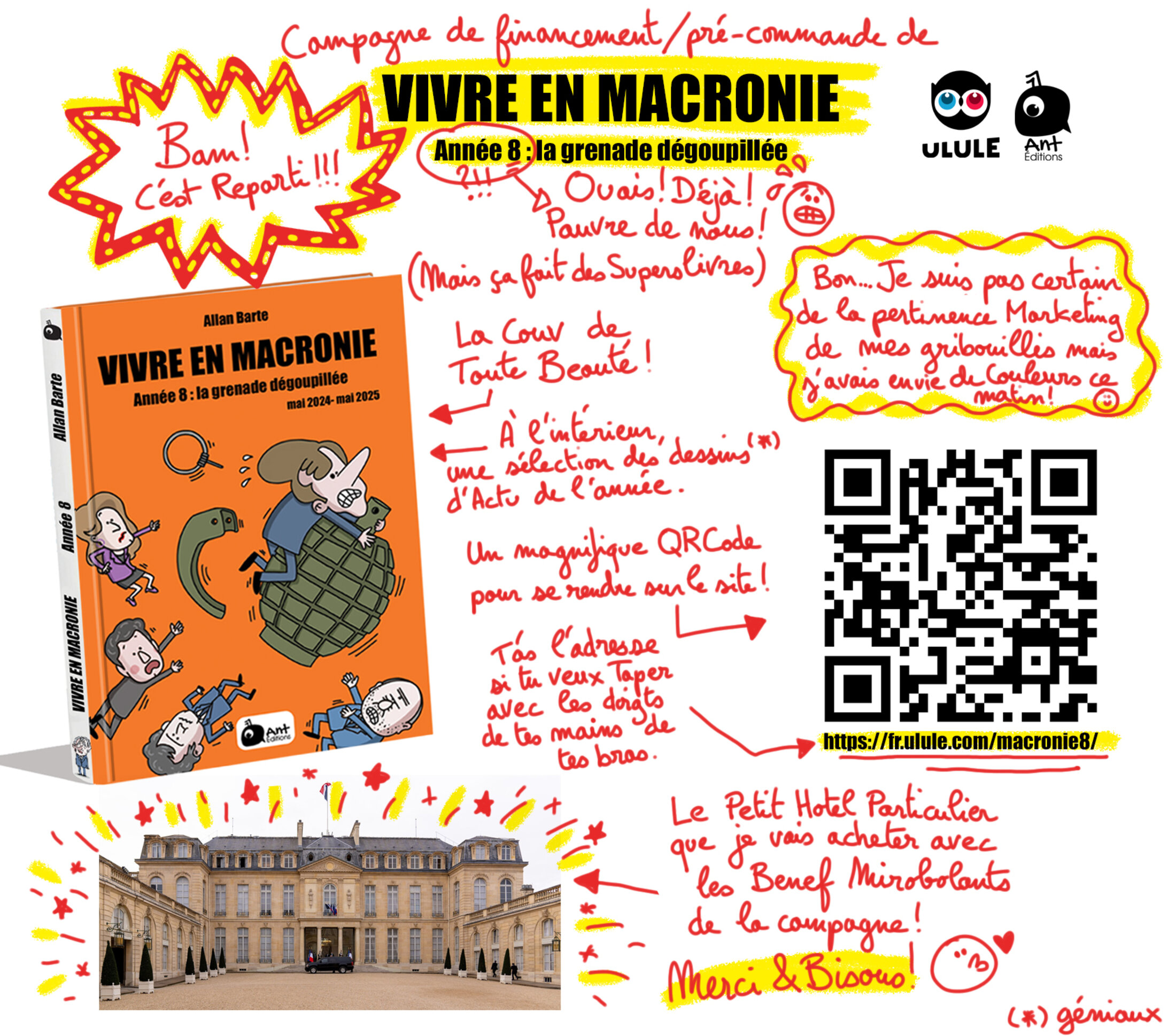 Une annonce sobre, efficace et très pro du lancement de la campagne de financement du Tome 8 de Vivre en Macronie. Bon, en vrai, il y a des gribouillis avec des remarques inutiles partout mais en résumé, la campagne commence, la couv représente Macron agrippé désespérément à une grenade dégoupillée. Autour de lui, d'autres Schiappa, Attal, Darmanin et Dupond-Moretti sont projetées dans les airs. Le lien vers la campagne : https://fr.ulule.com/macronie8/ Merci & Bisous ! :)