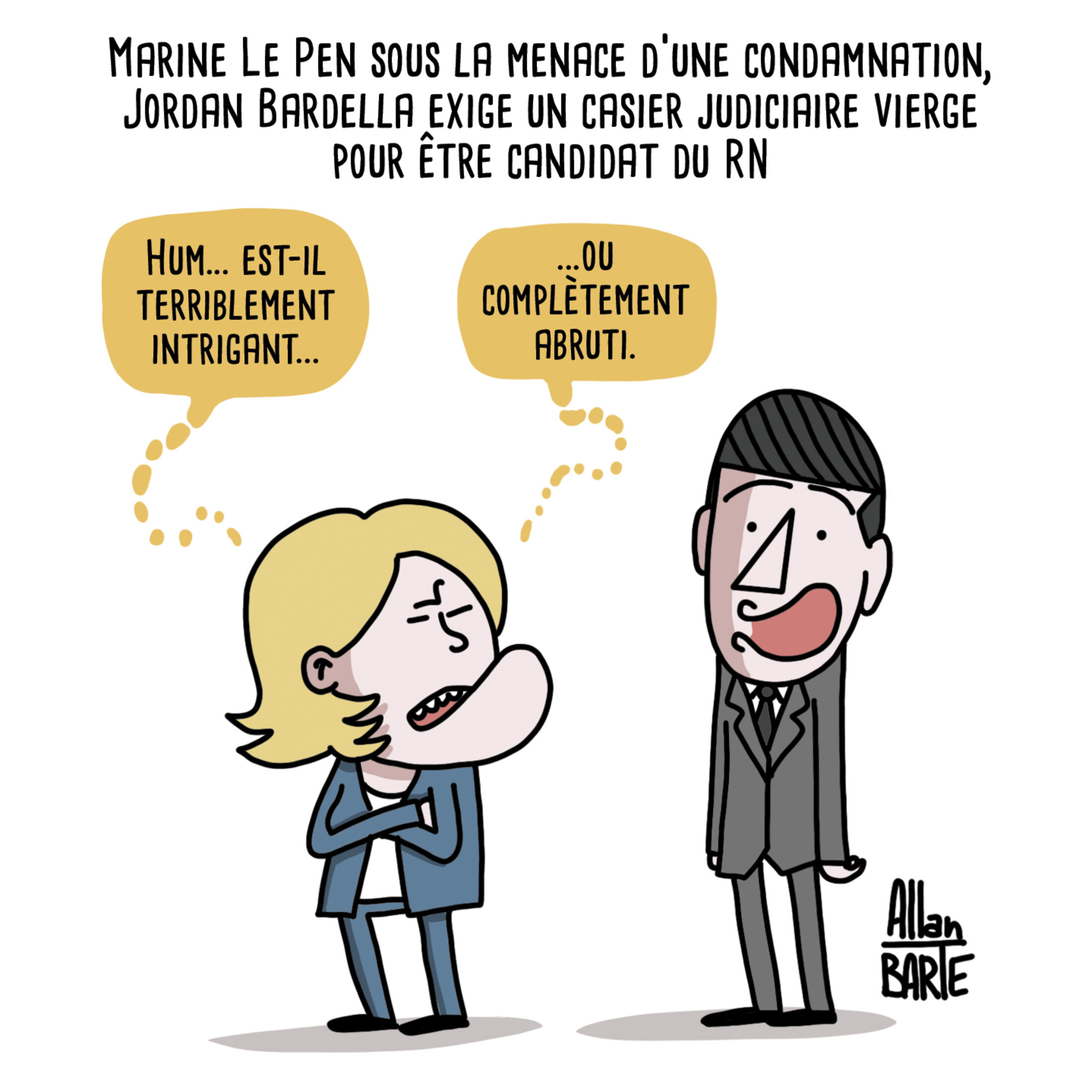 Titre : Marine Le Pen sous la menace d’une condamnation, Jordan Bardella exige un casier judiciaire vierge pour être candidat du RN. Marine Le Pen, méfiante, regarde du coin de l'œil Jordan Bardella arborant un grand sourire de chien fou-fou. - Hum... est-il terriblement intrigant... ...ou complètement abruti. © Allan BARRTE