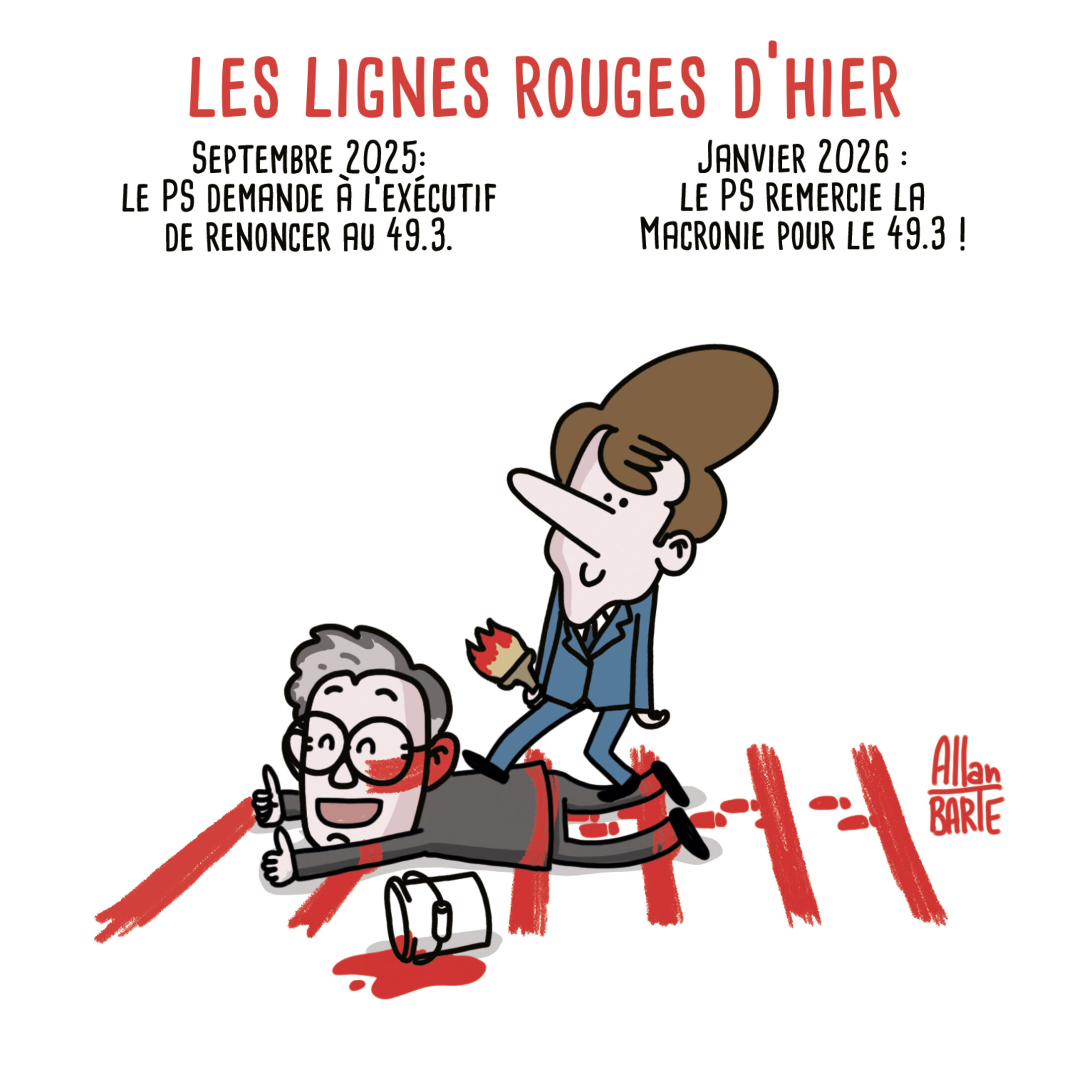 Dessin d'actualité d'Allan BARTE. Titre : Les lignes rouges d’hier En haut à gauche, le texte indique : « Septembre 2025 : le PS demande à l’exécutif de renoncer au 49.3. » En haut à droite, on peut lire : « Janvier 2026 : le PS remercie la macronie pour le 49.3 ! ». Le sol est marqué de larges traces rouges peintes au sol, symbolisant des « lignes rouges ». En travers, allongé au sol, peinturluré lui aussi de rouge, Olivier Faure, souriant et faisant un signe de pouce levé. Emmanuel Macron, pinceau à la main, marche joyeusement sur lui, continuant son chemin comme si de rien n'était.