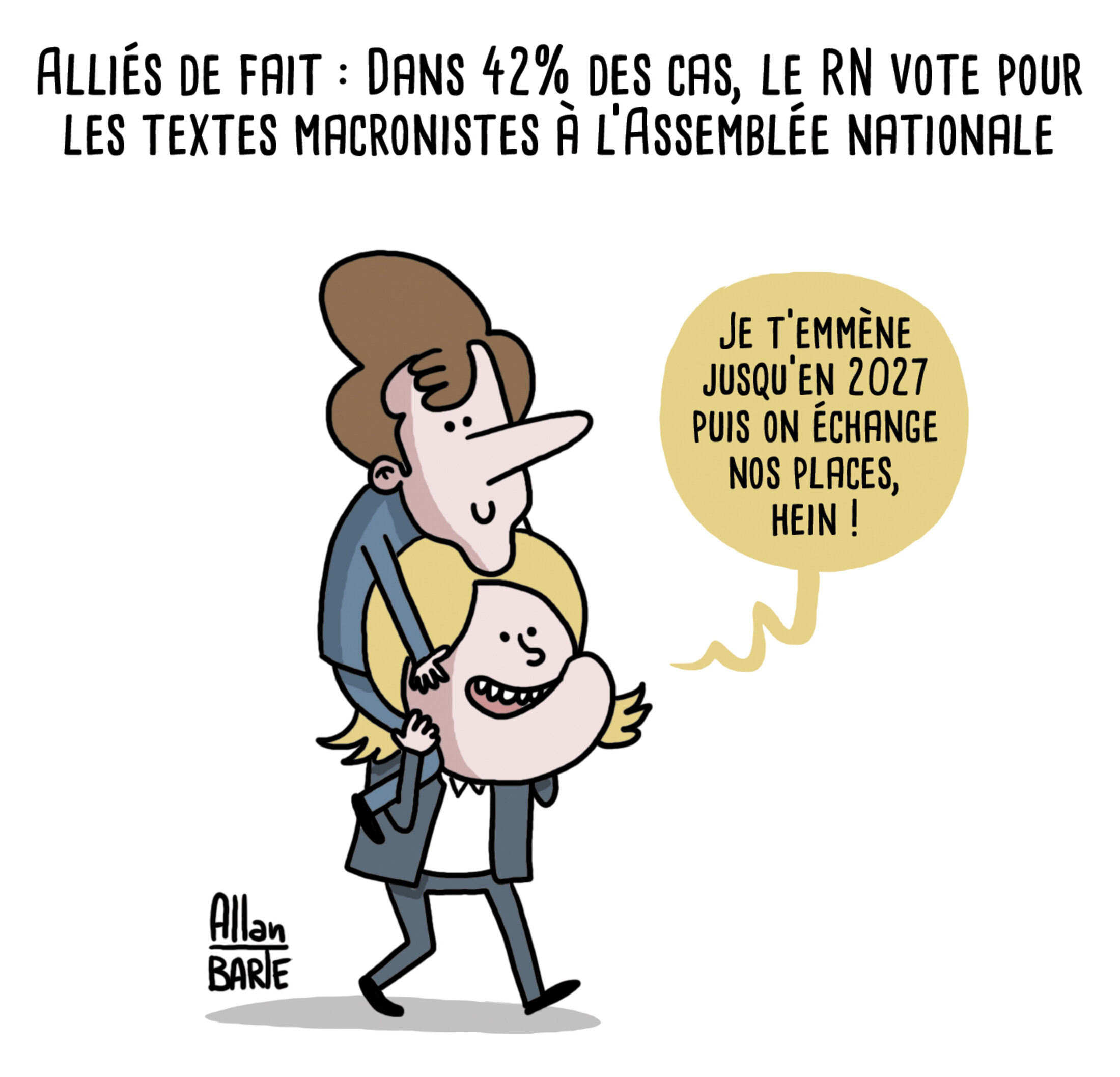 Titre du dessin : Alliés de fait : Dans 42% des cas, le RN vote pour les textes macronistes à l'Assemblée nationale Marine Le Pen porte sur ses épaule emmanuel Macron - Je t’emmène jusqu’en 2027 puis on échange nos places, hein !