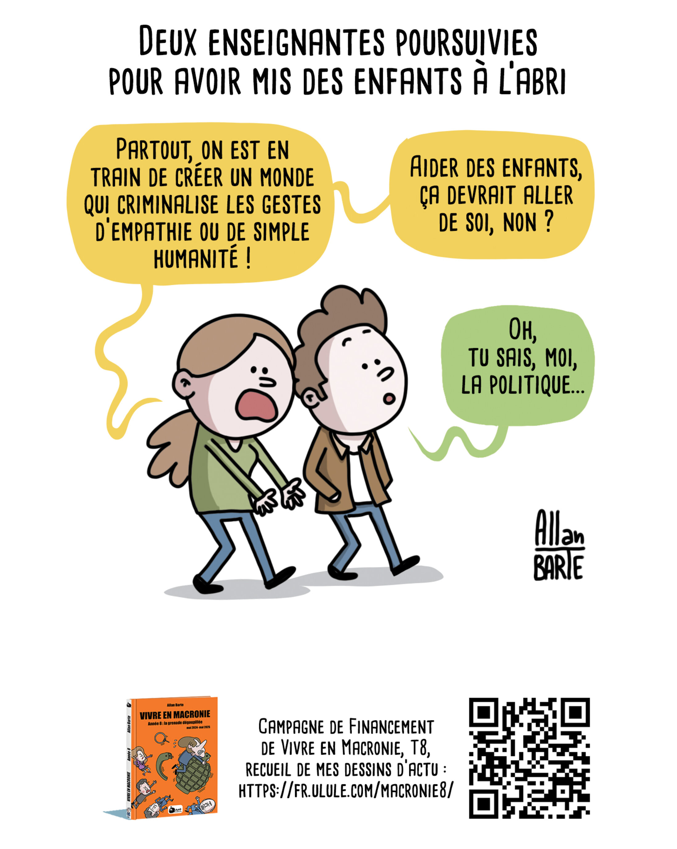Titre : Deux enseignantes poursuivies pour avoir mis des enfants à l’abri Deux personnages marchent en discutant, Le premier, révolté : - Partout, on est en train de créer un monde qui criminalise les gestes d’empathie ou de simple humanité ! - Aider des enfants, ça devrait aller de soi, non ? Le deuxième, un peu détaché de la conversation : - Oh, tu sais, moi, la politique…