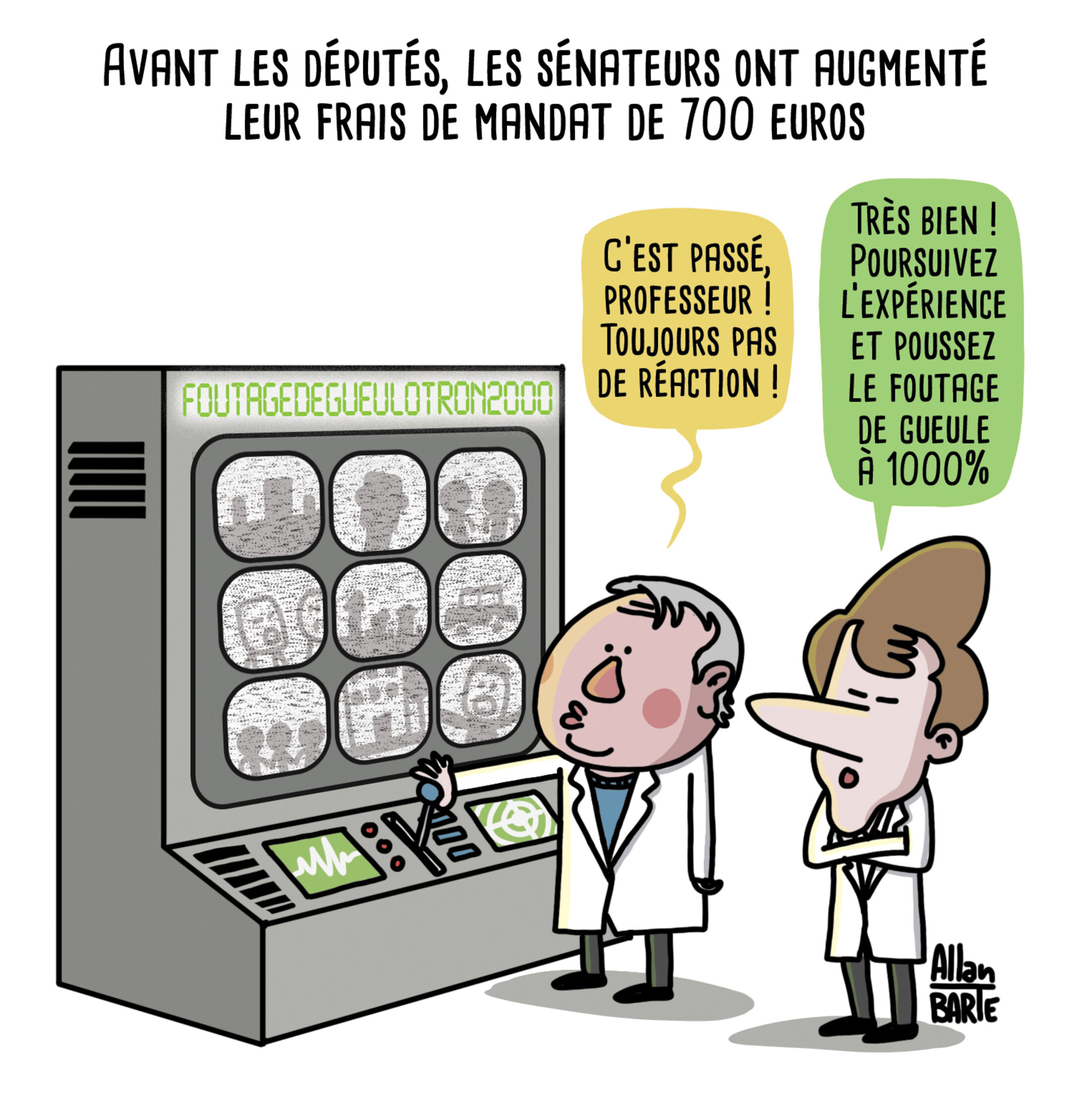 Titre : Avant les députés, les sénateurs ont augmenté leur frais de mandat de 700 euros Larcher et Macron, en blouse blanche de scientifique, se tiennent devant le FoutageDeGueulotron2000,une machine dotée de plein d'écran et de manette (à la manière des james bond des année 70) Larcher, manipulant la machine :- C’est passé, professeur ! Toujours pas de réaction !Macron, derrière, les bras croisés : - Très bien ! Poursuivez l’expérience et poussez le foutage de gueule à 1000%