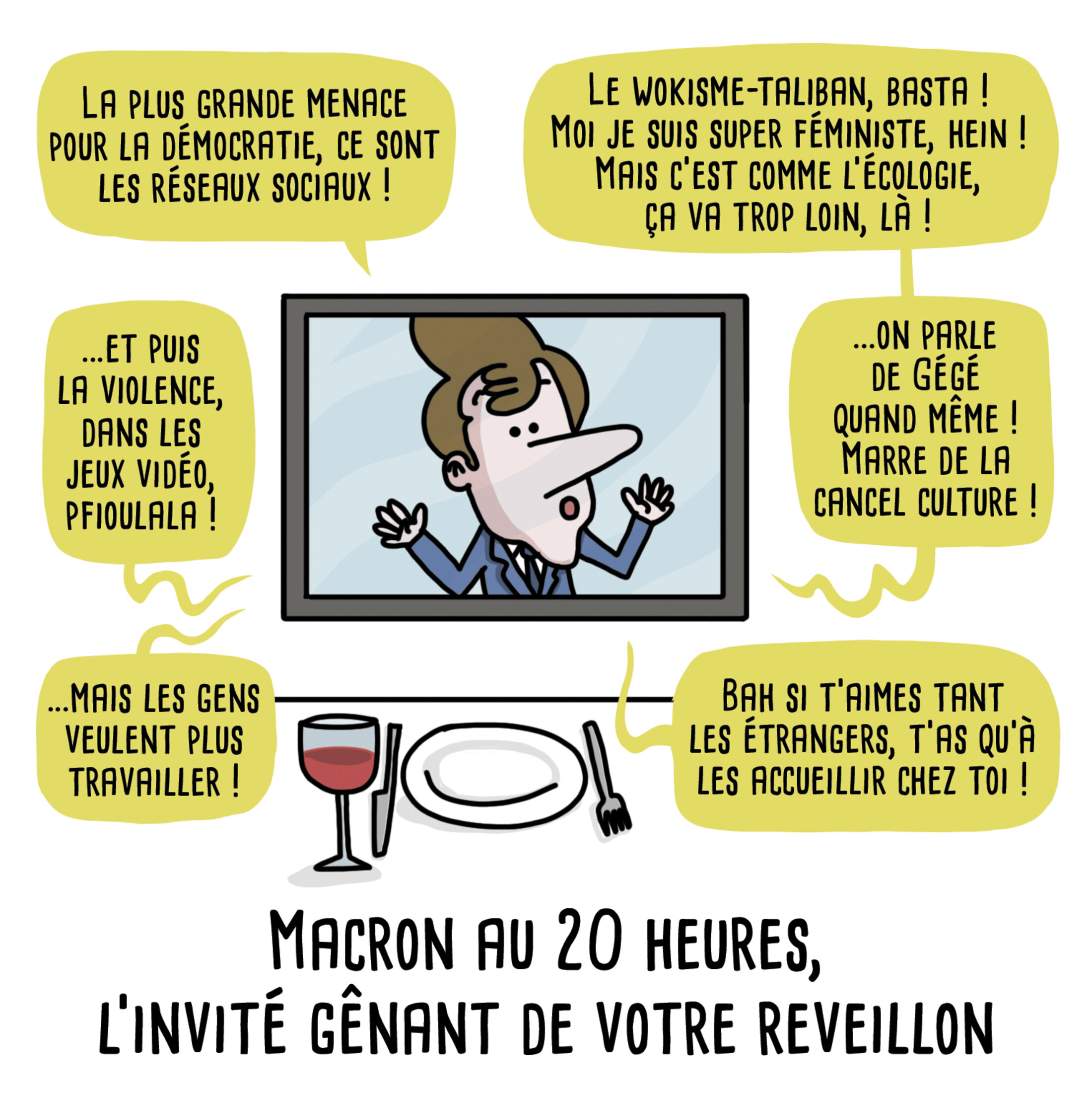 Devant une assiette et des couverts est placée une télé. Macron y trône, comme un convive. - La plus grande menace pour la démocratie, ce sont les réseaux sociaux !- ...et puis la violence, dans les jeux vidéo, pfioulala !- ...mais les gens veulent plus travailler !- Le wokisme-taliban, basta ! Moi je suis super féministe, hein ! Mais c’est comme l’écologie, ça va trop loin, là !- ...on parle de Gégé quand même ! Marre de la cancel culture !- Bah si t’aimes tant les étrangers, t’as qu’à les accueillir chez toi ! Titre : Macron au 20 heures, l’invité gênant de votre réveillon