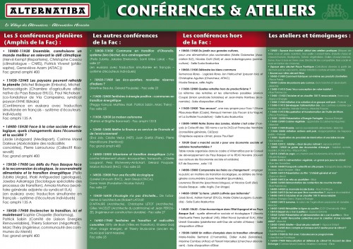 Le programme complet d'Alternatiba faisant près de 50 pages, voici le PLAN-PROGRAMME d'Alternatiba, tout le Village des alternatives résumé en deux pages, pour glisser dans la poche !Version PDF en noir et blanc (2,1 Mo)
