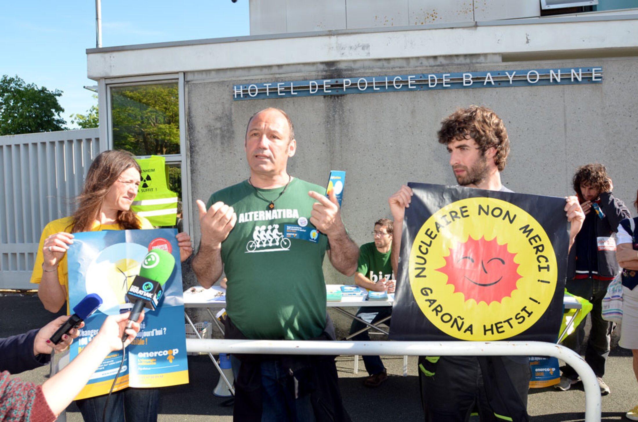 Une nouvelle procédure sera-t-elle engagée contre Txetx Etcheverry qui a réalisé ce matin une nouvelle prise de parole publique sur le trottoir longeant cette fois l'entrée du... commissariat de Bayonne, juste avant d'y être auditionné ? Sans demande d'autorisation préalable, il y a expliqué devant une soixantaine de personnes venues le soutenir l'incompatibilité entre la politique nucléaire et la transition énergétique. Il y a appelé à la fermeture immédiate de Fesseinhem, conformément à l'engagement du président de la République François Hollande. Il y a également appelé à une manifestation le samedi 11 juin à Gasteiz pour exiger la fermeture définitive de la centrale nucléaire de Garoña, située juste à côté du Pays Basque sud, jumelle de celle de Fukushima, entrée en fonctionnement en 1971 et dont l'entreprise propriétaire Nuceonor demande la réouverture jusqu'en 2031 !