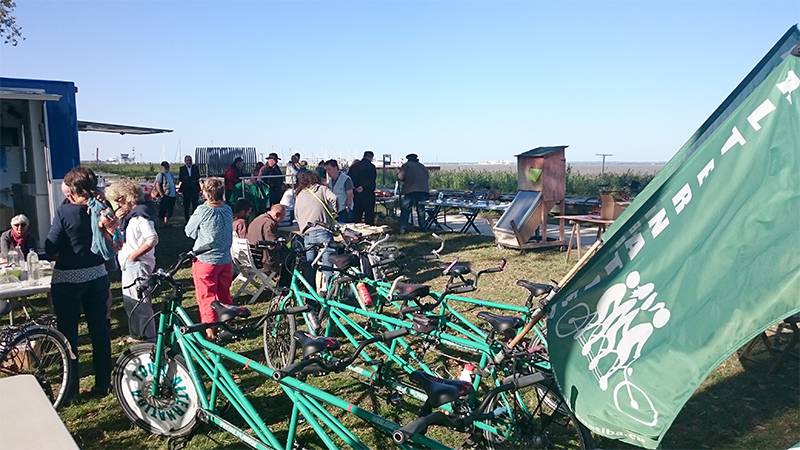 Pour apporter un peu de repos à nos mollets, nous optons pour l'inter-modalité et embarquons avec les triplettes sur le ferry au départ de Royan qui nous permet de traverser les 8 km qui séparent les deux rives de ce lieu de rencontre entre les eaux de la Garonne et celles de l'Océan Atlantique. Nous arrivons donc au Verdon-sur-mer où nous attendent impatiemment des vélorutionnaires très enthousiastes. Le temps de préparer notre vélo sono, notre quadruplette, et hop ! C’est parti pour un parcours à travers cette petite ville à l’ambiance balnéaire pour clamer haut et fort l'appel à la transition écologique et au changement de société.