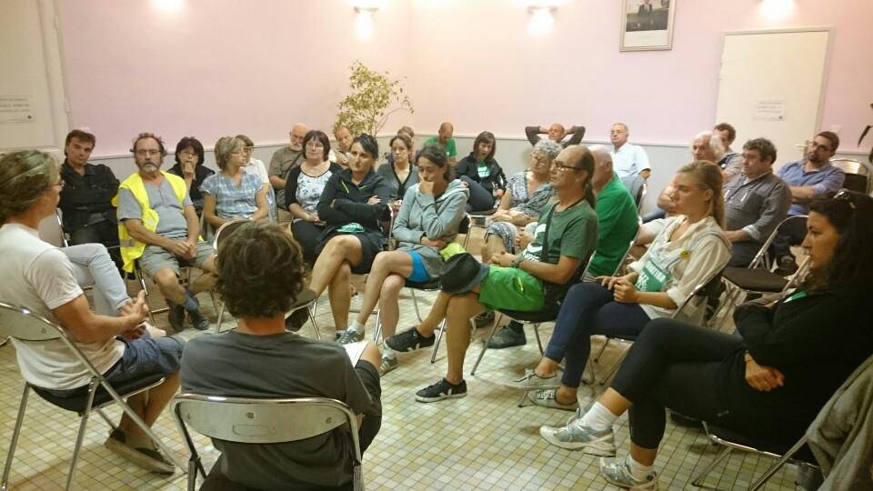 Nous discutons également avec Eric, qui a rejoint l'équipe du Tour. Ce militant marseillais est aussi membre de la coordination nationale de Eau Bien Commun. Au cours de la conversation, notre coéquipier exprime ses motivations pour participer au tour. Citoyen engagé et de sensibilité écologiste, Eric a vécu l'échec du sommet de Copenhague sur le climat. Dès qu'il a été informé que la COP21 se tiendrait cette année en France, il a naturellement marqué ce temps comme une période intense de mobilisation. Ayant conscience de l'urgence et de la gravité du changement climatique, il s'inscrit entièrement dans le message porté par Alternatiba. Ainsi, après avoir participé à la coordination du village des alternatives “Alternatibaïoli” à Marseille, il avait la volonté de rejoindre le Tour en faisant le plus d'étapes possibles, en fonction de ses disponibilités. Il a donc très facilement intégré l’équipe et apporte sa part de colibri dans la lutte pour le climat.